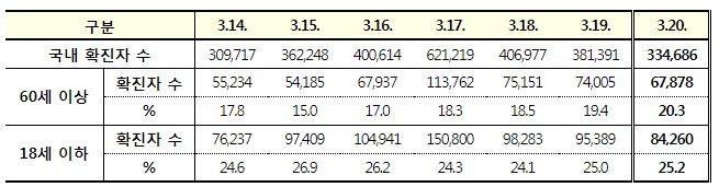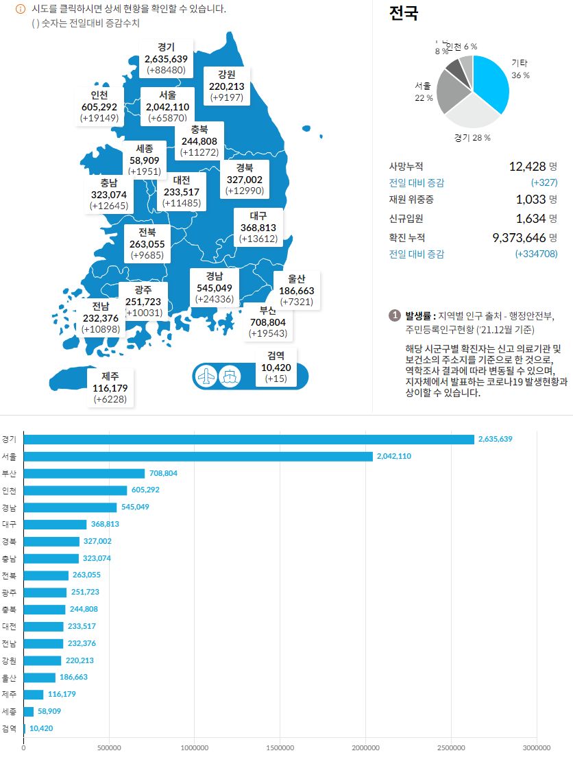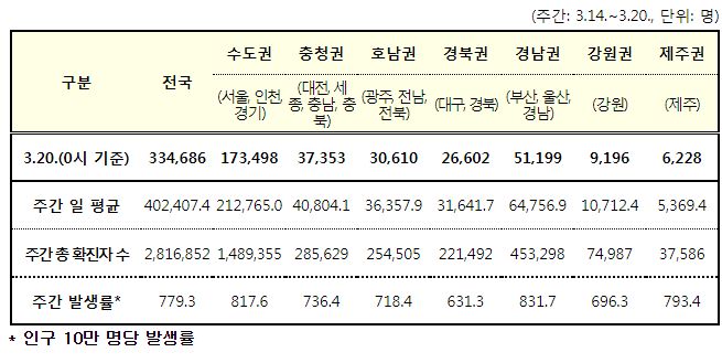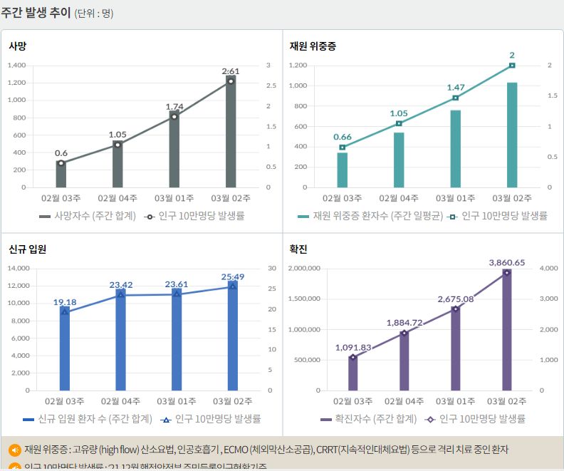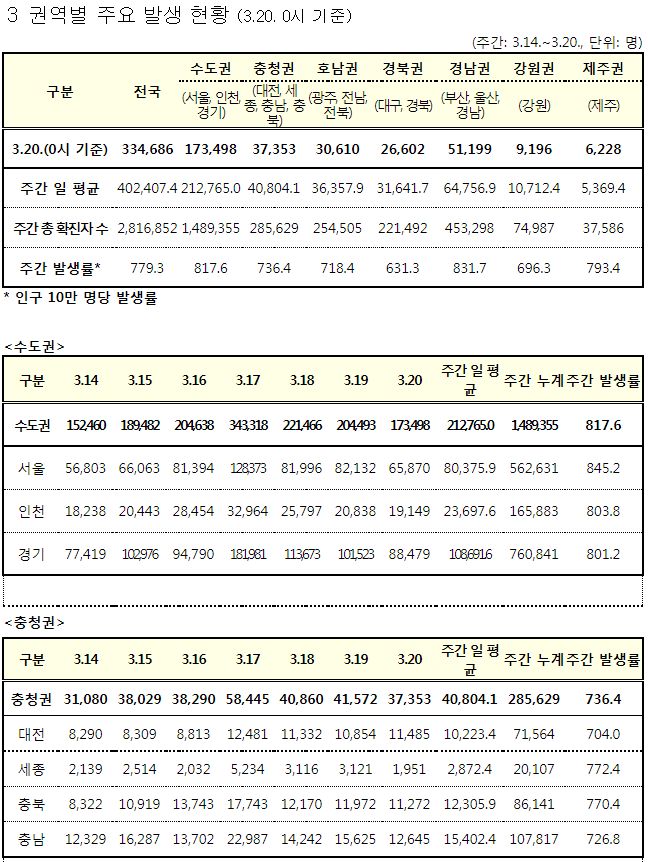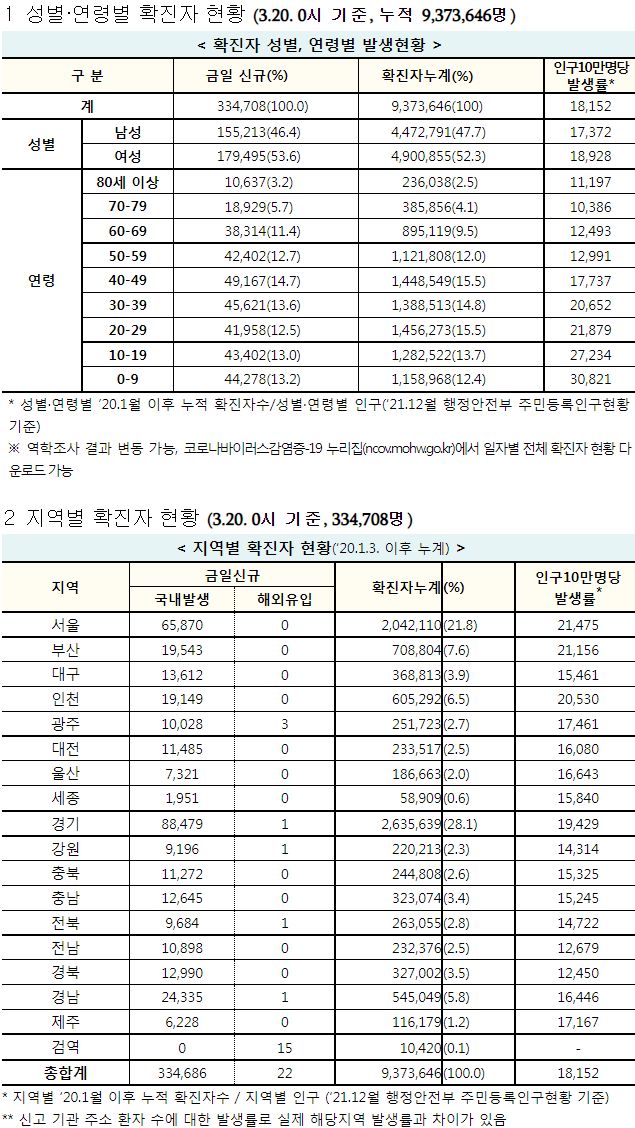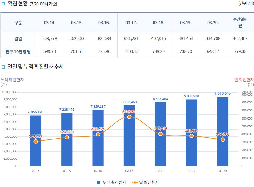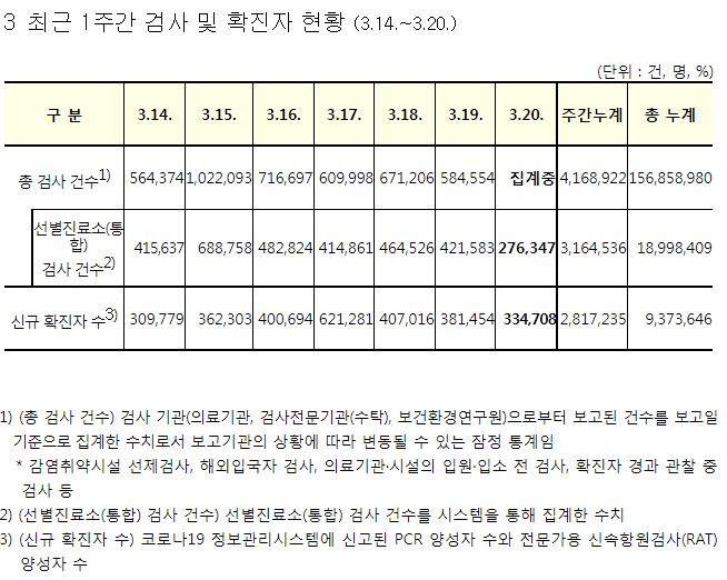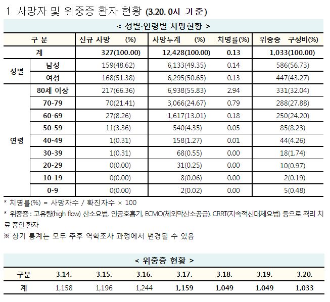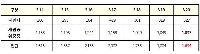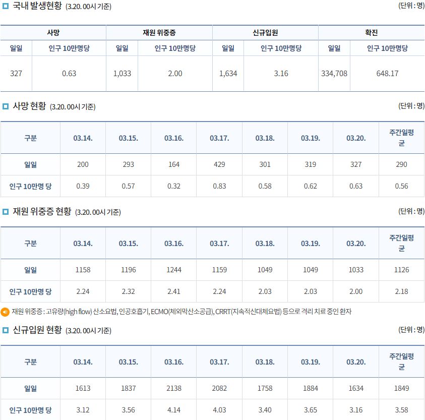 코로나19집계(2022.3.20. 0시기준): 확진 +33만, 사망 +327명, 중환자실 66%, 재택치료 215만(집중 32만) 본문
