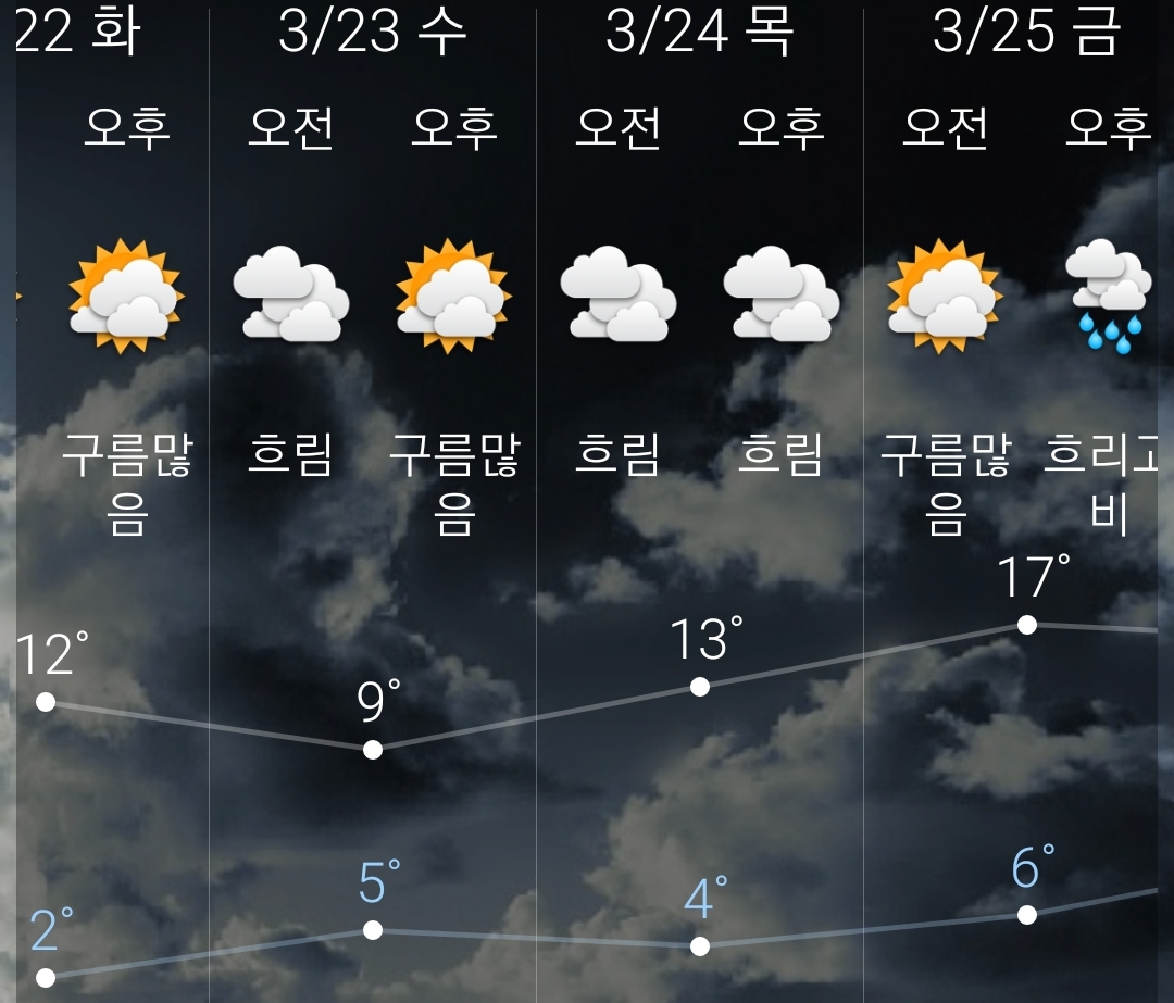 주말 최고기온은 상당히 따뜻해지는데, 그래도 최저기온은 아직입니다. 초봄이라 이거죠.