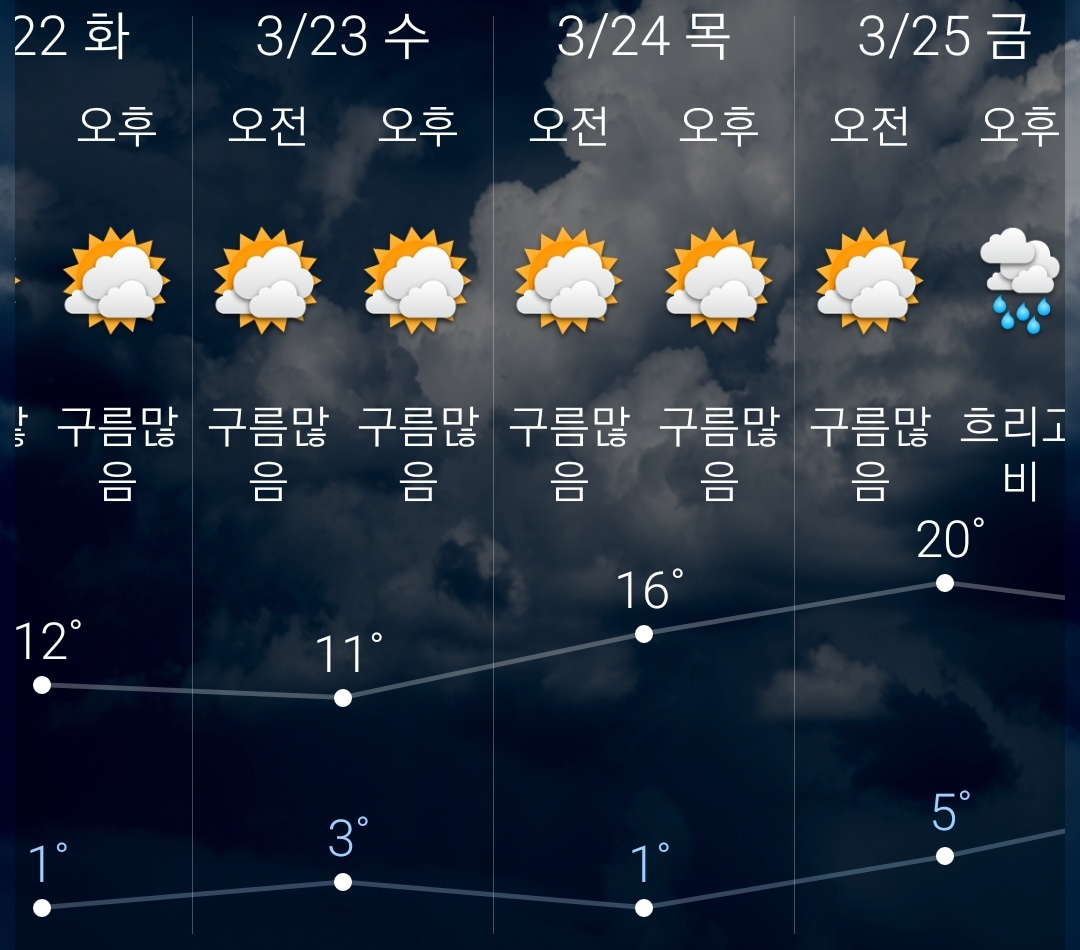 지난 주 비가 푹 오면서부터 최저기온이 슬쩍 내리기 시작한 것 같은데, 금주가 이렇고 내주는 최저기온도 약간 오릅니다. 그렇게 끌고 밀면서 봄이 오겠죠.