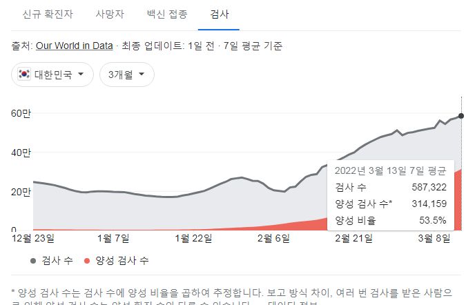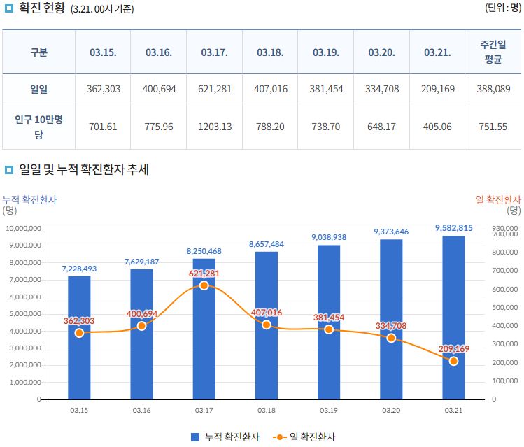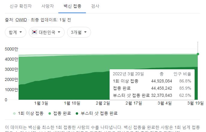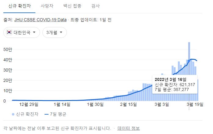 그리고 현재인데, 어쨌거나 드디어, 정부공인 확진자(= 공식 감염자)수 1천 만 명을 앞두고 있습니다. 수도권(서울, 경기, 인천)과 부산은 이미 감염 경험자가 지역 인구의 20%를 넘긴 것 같네요.