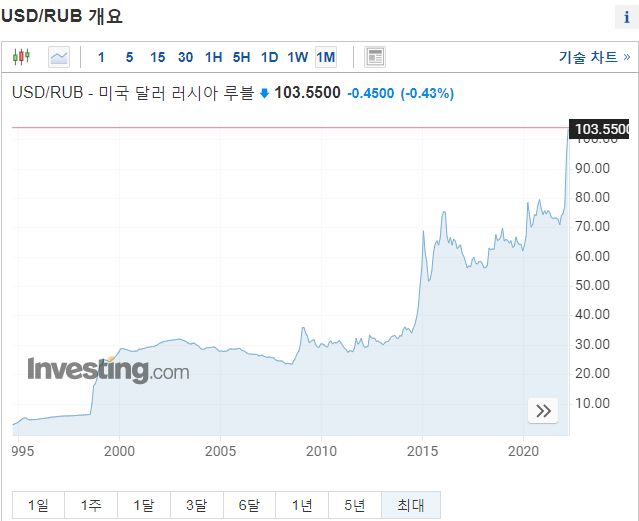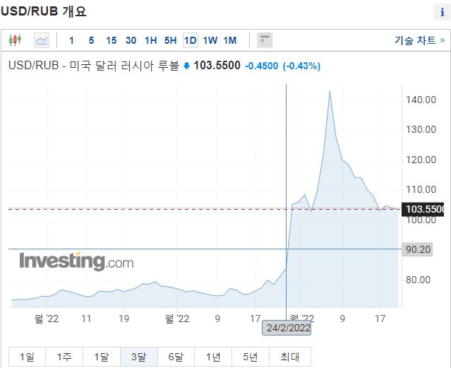 러시아가 우크라이나를 침공한 후 루블화는 급락(= 가치절하)했지만, 푹푹 떨어지지만은 않고 3월들어 100루블 근처에서 안정세입니다.