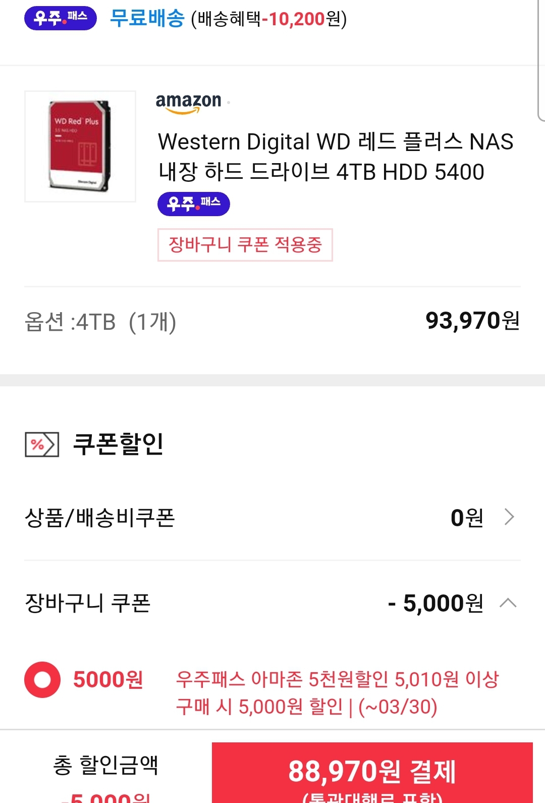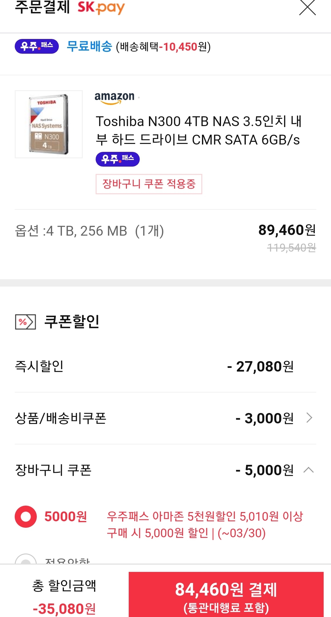 상품페이지에서 받을 수 있는 아마존 5%쿠폰에, 우주패스 장바구니쿠폰.