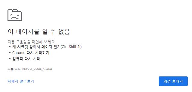 그러면 유튜브 동영상이 재생되고 있던 웹페이지나, 동영상이 로드된 웹페이지에서 이런 식으로 화면이 에러표시가 나며 정지됩니다.