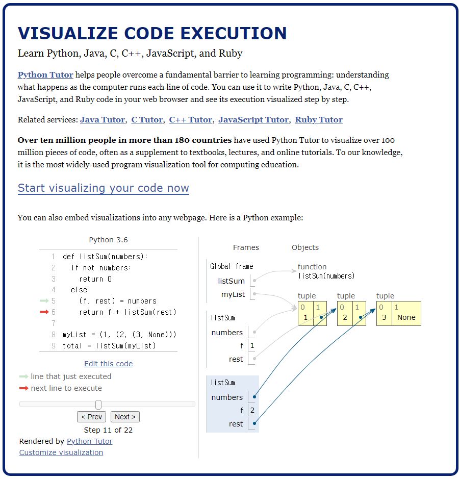 Python Tutor - Visualize Python, Java, JavaScript, C, C++, Ruby code execution