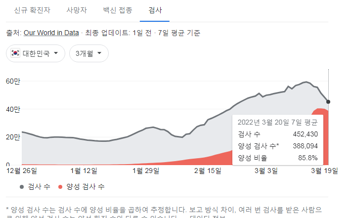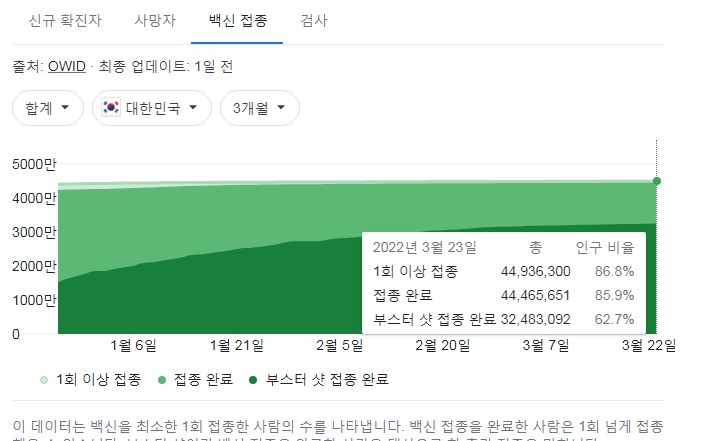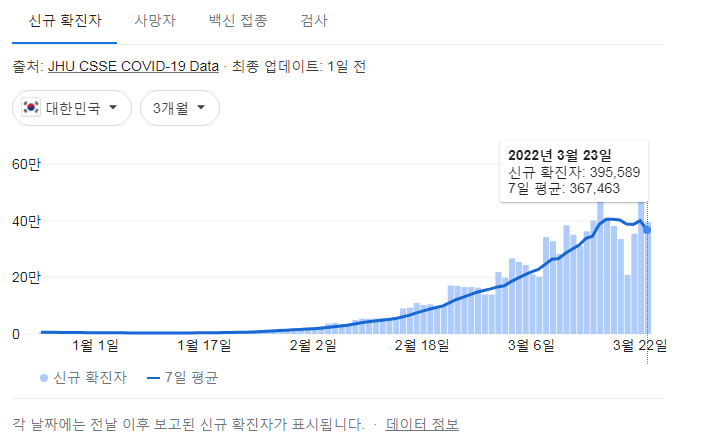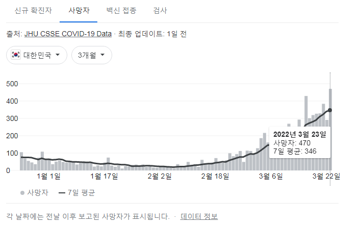 | 코로나19집계(2022.3.23. 0시기준): 확진 +49만, 사망자 +291명, 중환자실 가동률 65%, 재택치료 183만(집중 27만)/:/ 구글그래프 * (0) | 2022.03.23 |