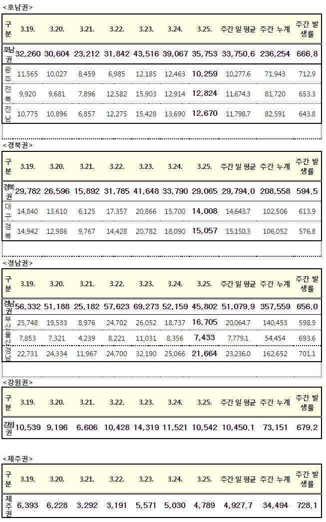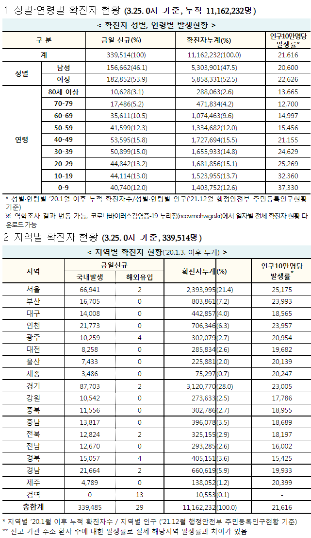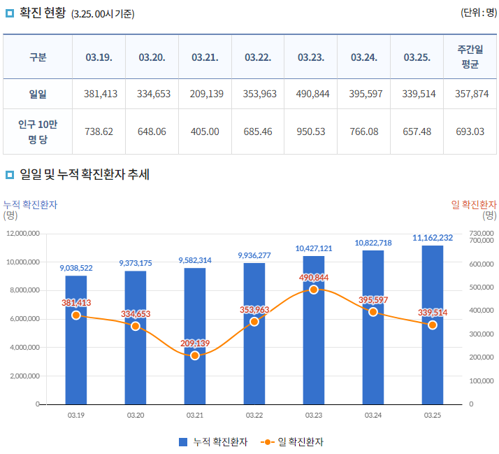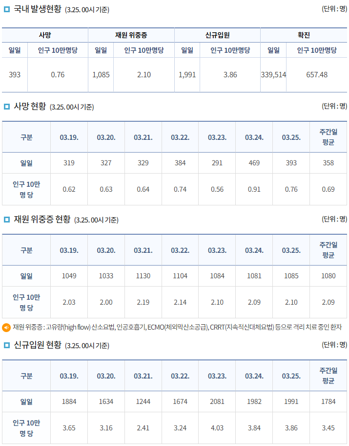 코로나19집계(2022.3.25. 0시기준): 확진 +34만, 사망 +393명, 중환자실가동률 66%, 재택치료 189만(집중 28만) 본문