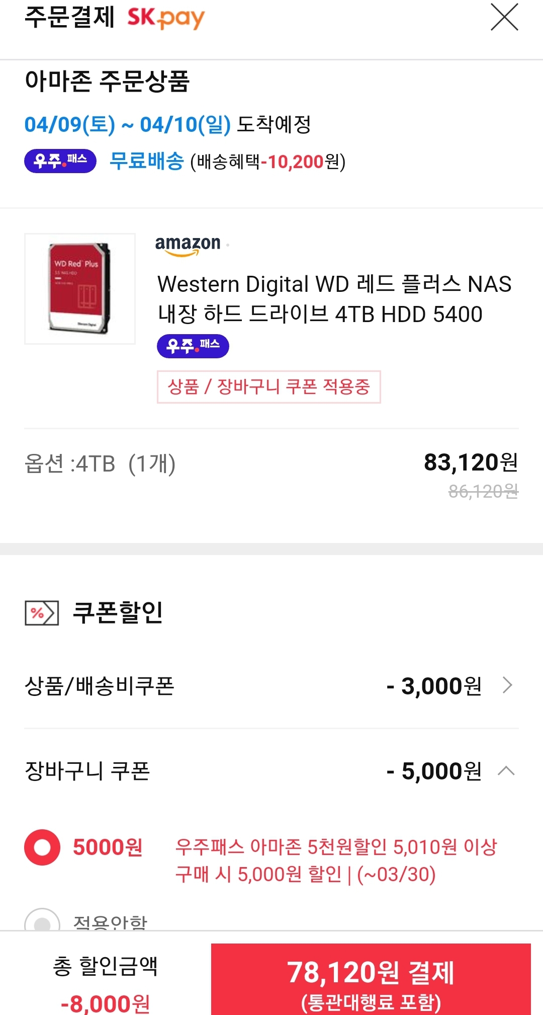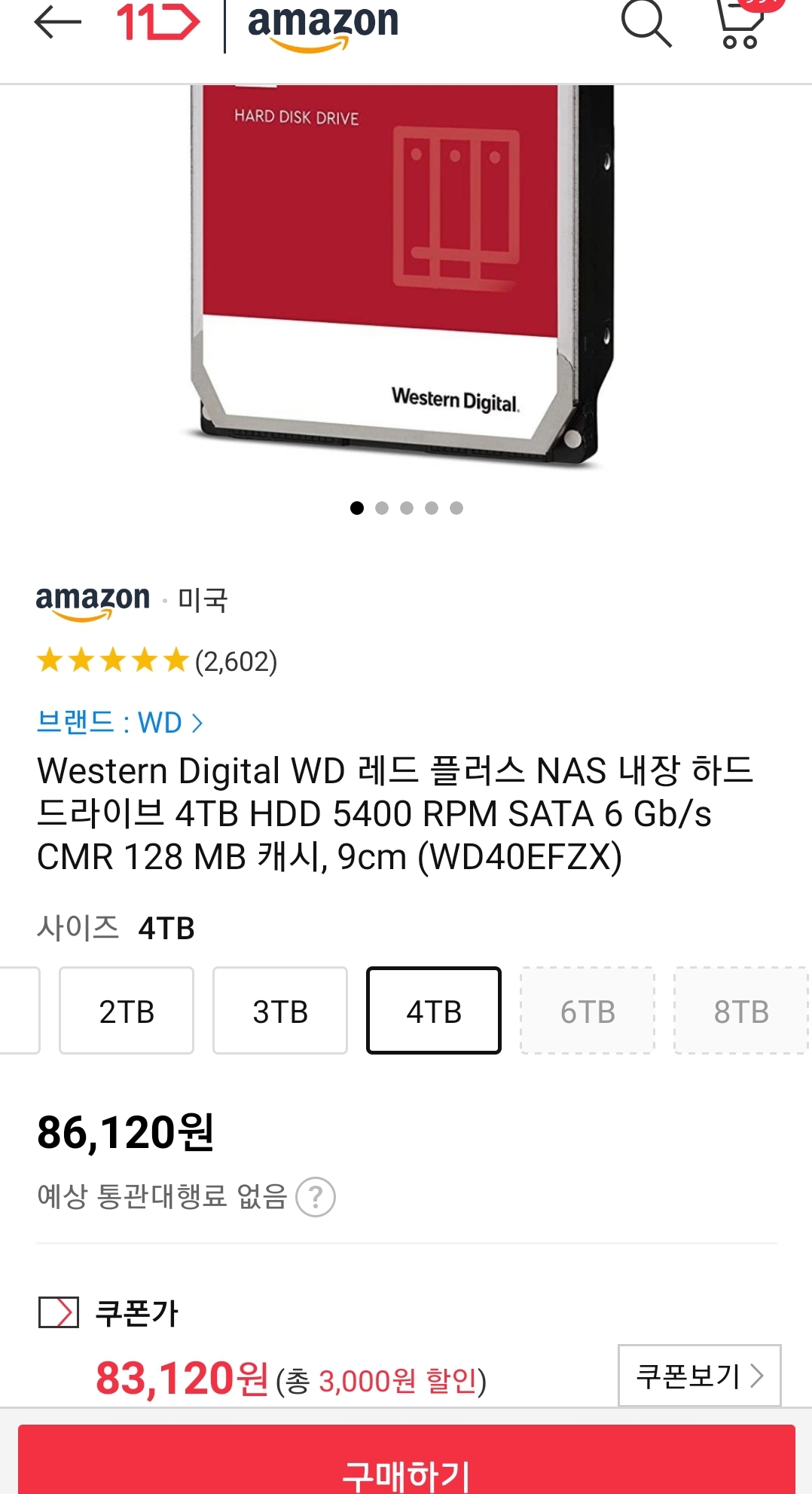 (11번가-아마존) WD 레드 플러스 NAS 하드 4TB 5400RPM CMR 128MB캐시 (~7.8만원/우주패스) 본문