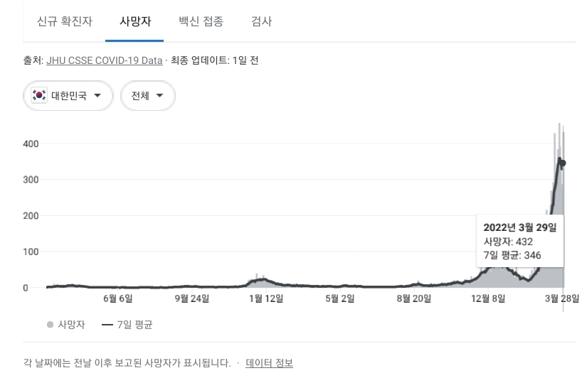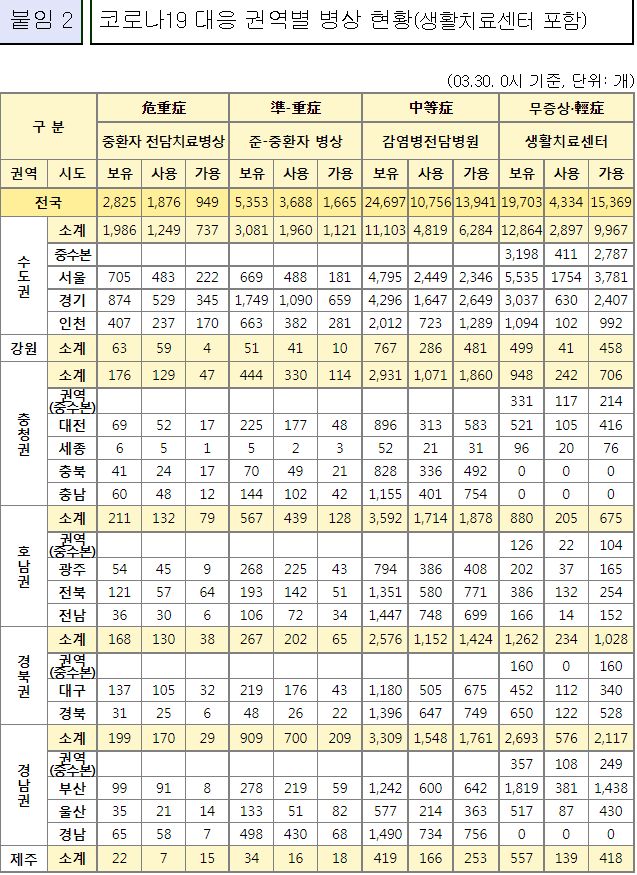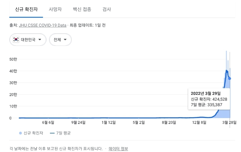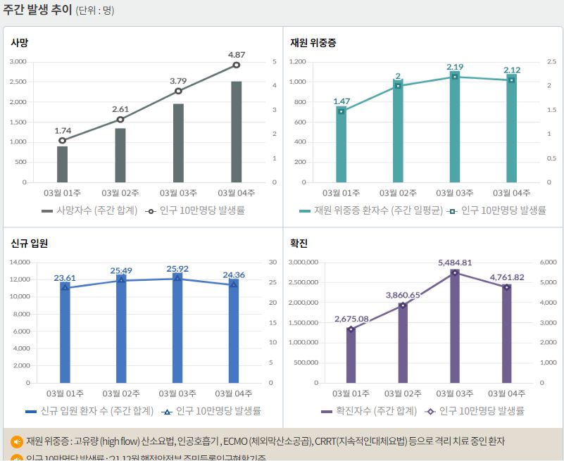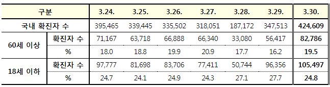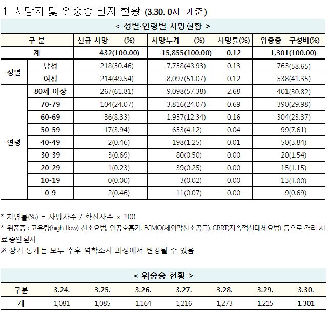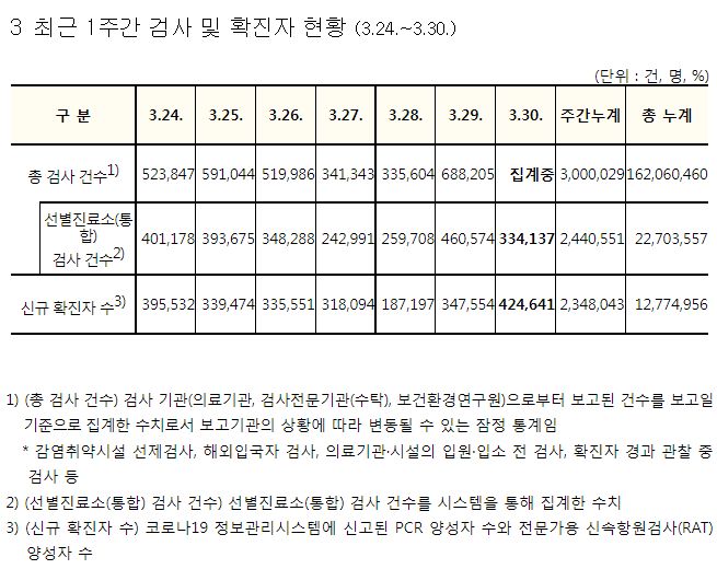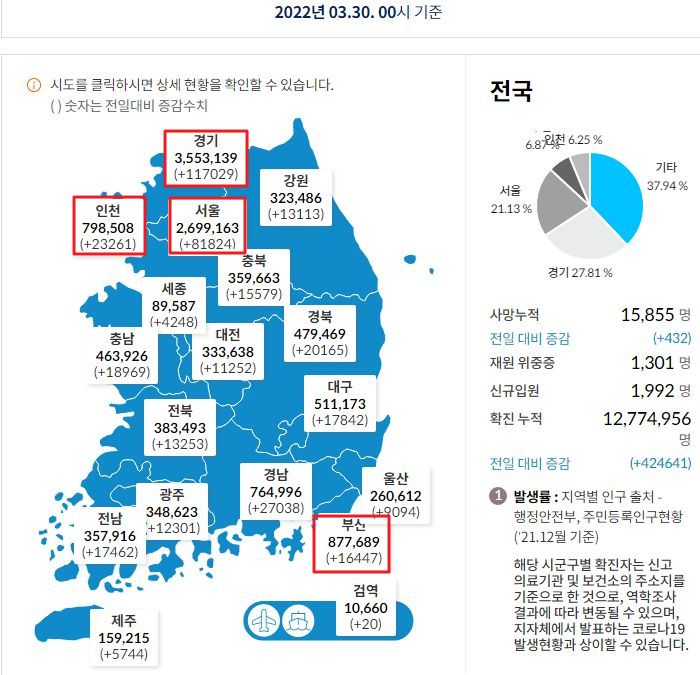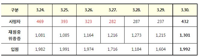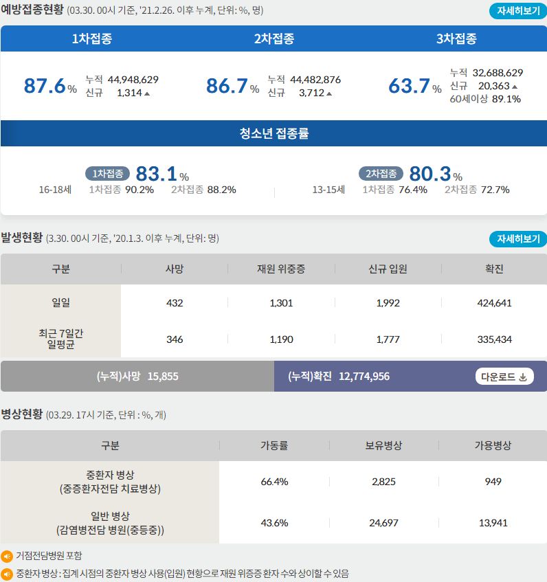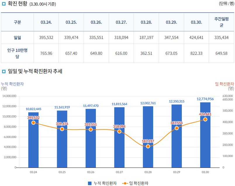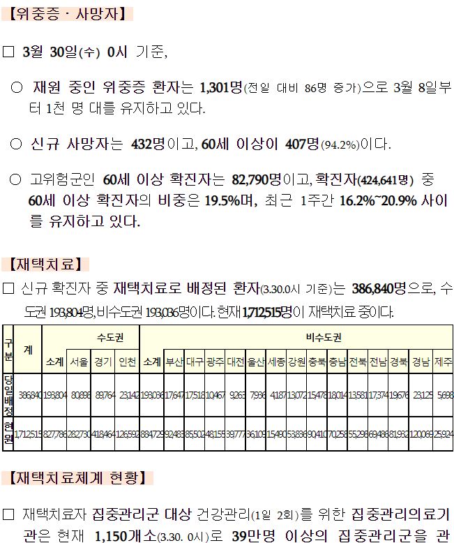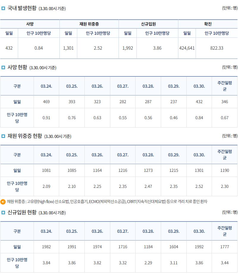코로나19집계(2022.3.30. 0시기준): 확진 +42만, 사망 +432명, 중환자실가동률 67%, 재택치료 171만(집중 21만) 본문
