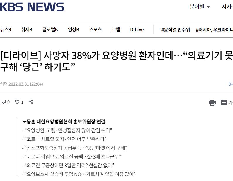 코로나19 사망자중 요양병원, 요양시설 비중이 32.7%로 나타나 한 달간 2,550명이 사망한 것으로 추산(2022.3.31. 질병청브리핑).. 공식 집계된 사망자만 해도 이런 상황입니다.