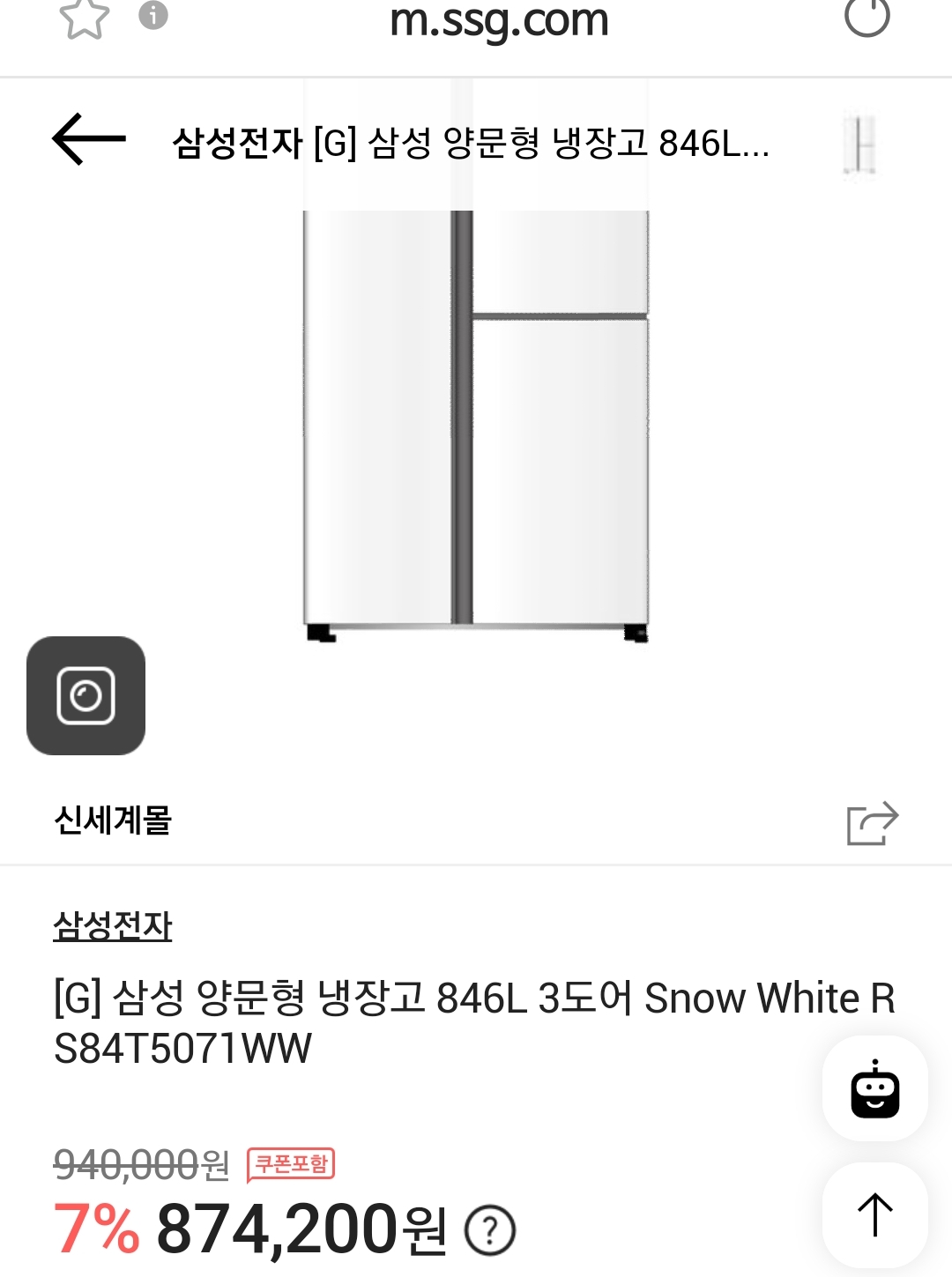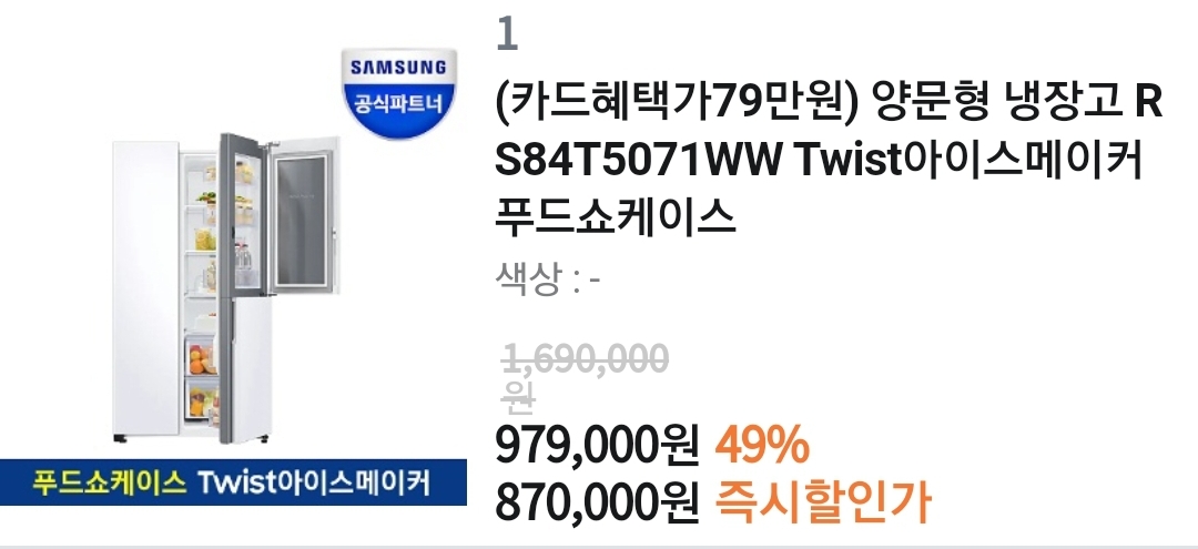어느 80~90만원짜리 800리터급 냉장고 세일(링크): 삼성전자 양문형 냉장고 RS84T5071WW 본문