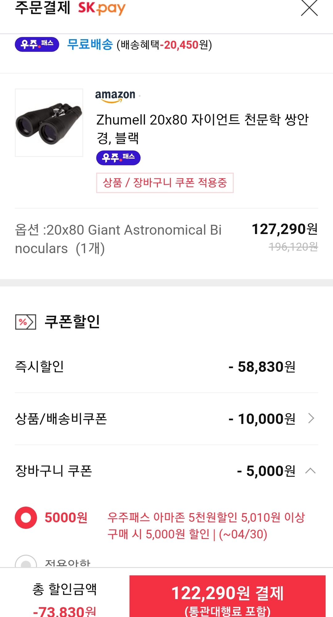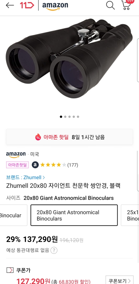 (11번가-아마존) Zhumell 20x80 쌍안경 (12.3만/우주패스, 12.8만/일반) 본문