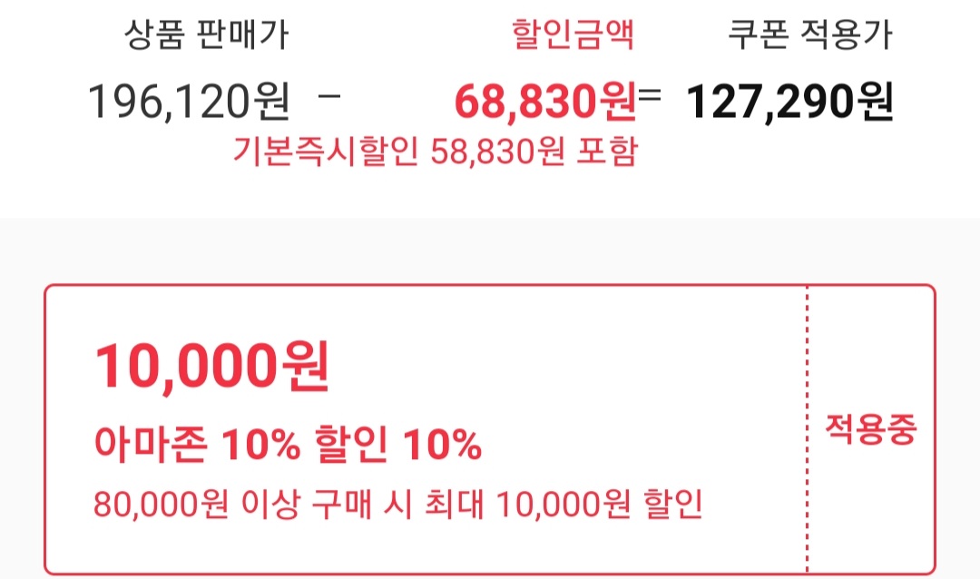 상품페이지에서 아마존10%할인쿠폰을 받고, 결제페이지에서 우주패스 장바구니쿠폰을 적용합니다.