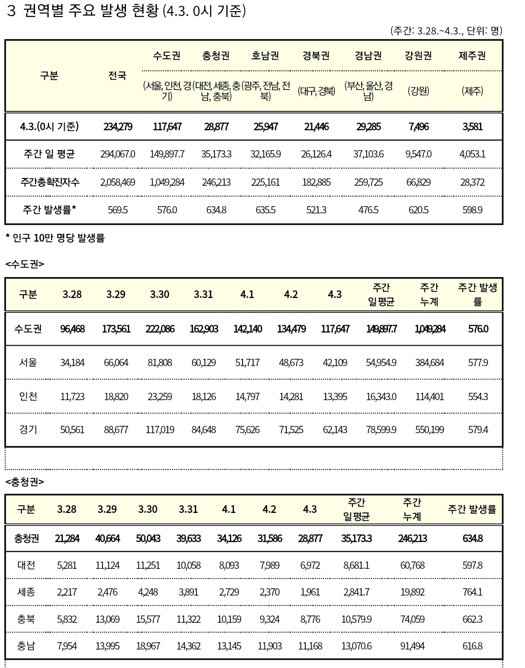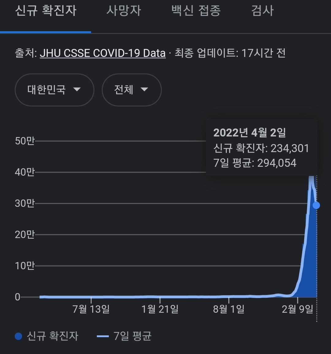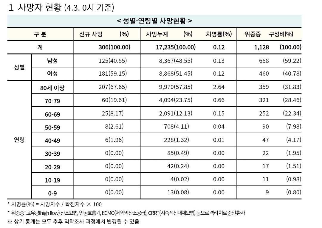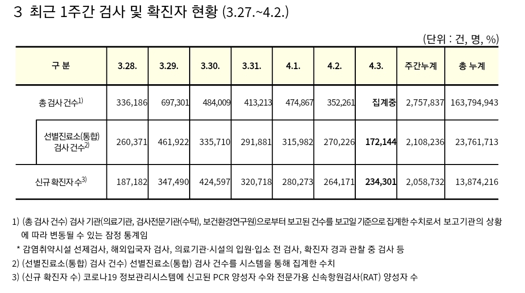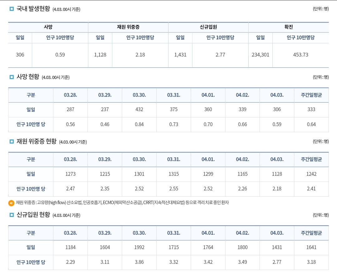코로나19집계(2022.4.3. 0시기준): 확진 +23만, 사망 +306명, 중환자실가동률 67%, 재택치료 169만(집중 16만) 본문