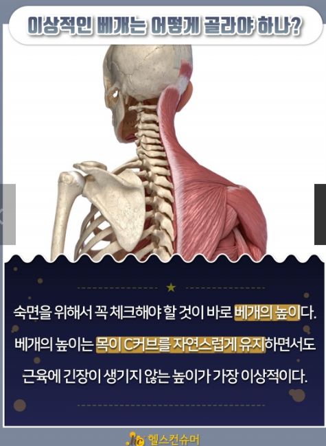 베개의 높이: 높지 않을 것, 낮지 않을 것/:/ 잠잘 때 바로 누운 자세와 옆으로 누운 자세의 베개높이, 척추와 머리 각도 본문