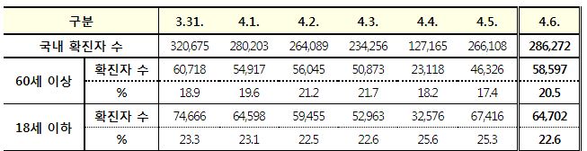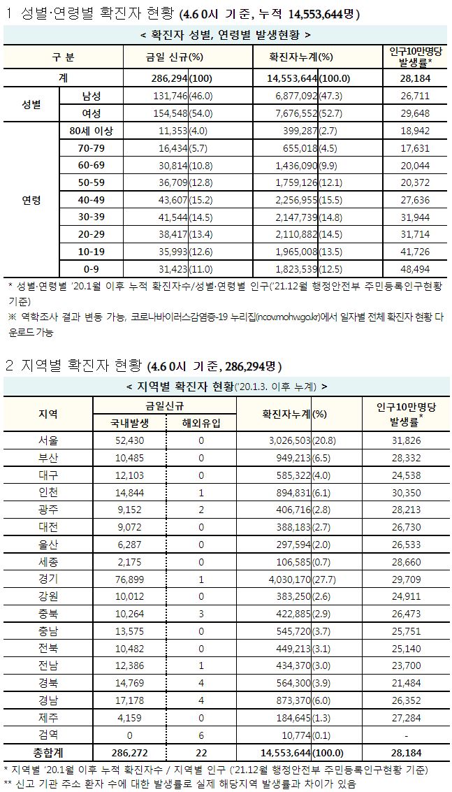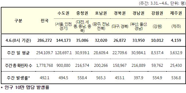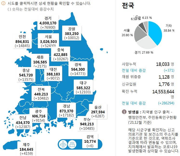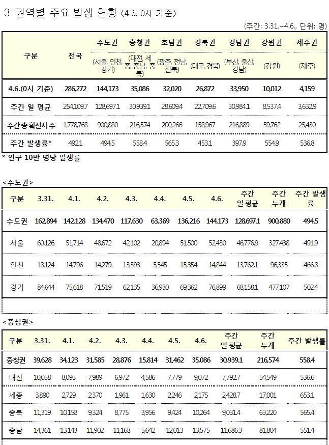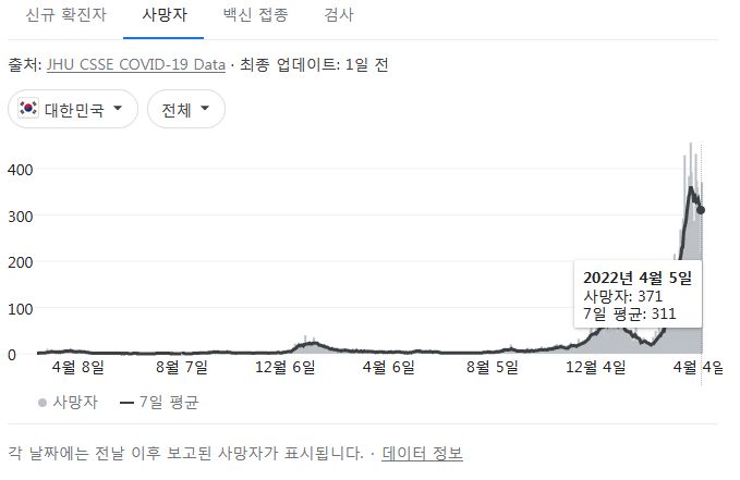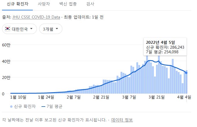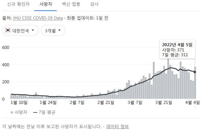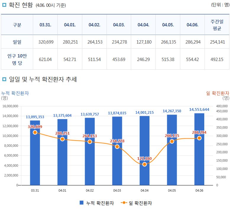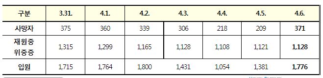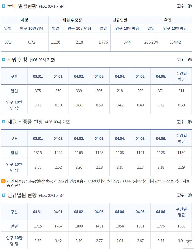 코로나19집계(2022.4.6. 0시기준): 확진 +29만, 사망 +371명, 중환자실가동률 59%, 재택치료 134만(집중 13만) 본문