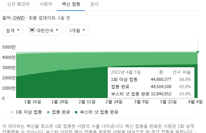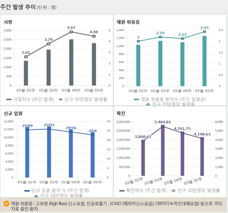 | 코로나19집계(2022.4.5. 0시기준): 확진 +27.4만, 사망 +209명, 중환자실가동률 65%, 재택치료 138만(집중관리 13만) (0) | 2022.04.05 |