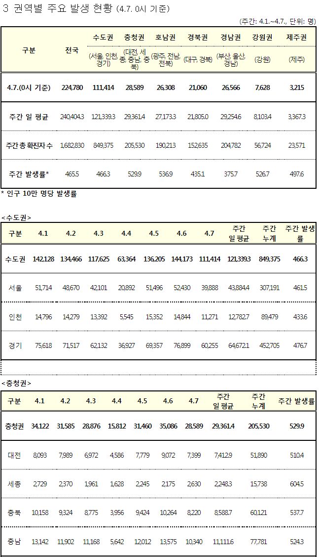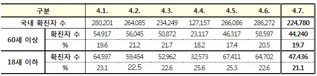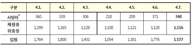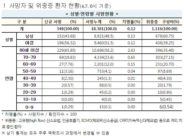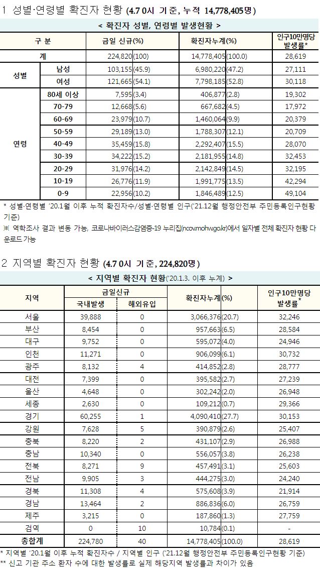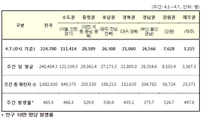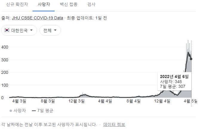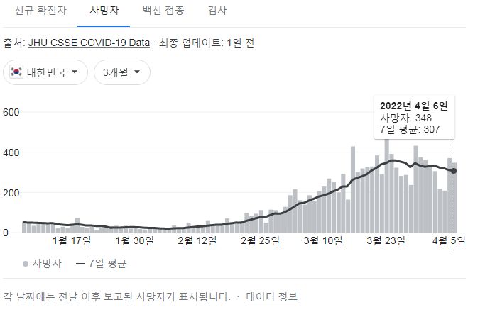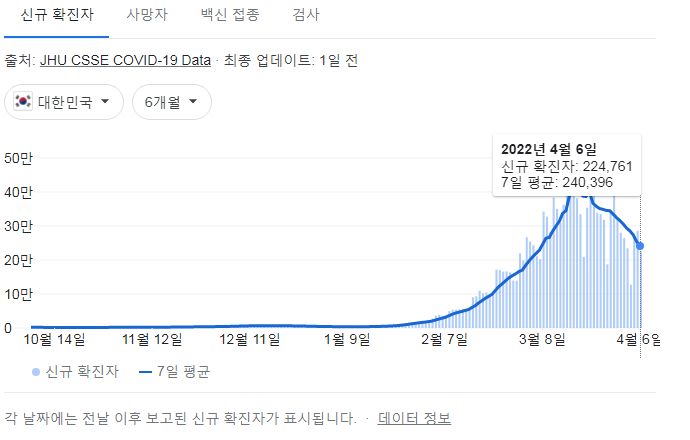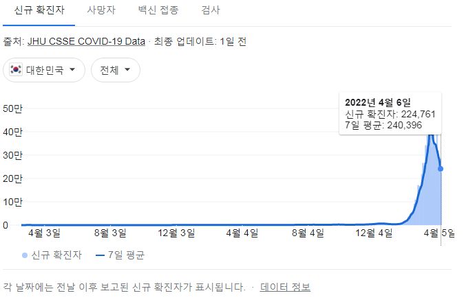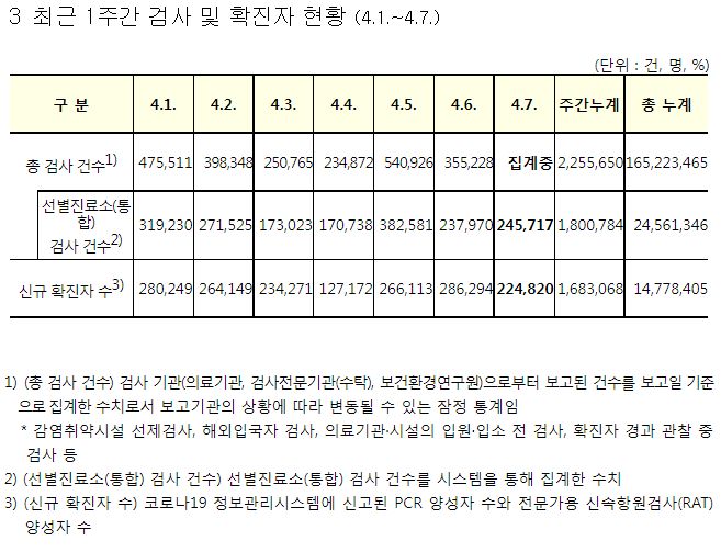 코로나19집계(2022.4.7. 0시기준): 확진 +22.5만, 사망자 +348명, 중환자실가동률 59%, 재택치료 131만(집중관리 12만) 본문