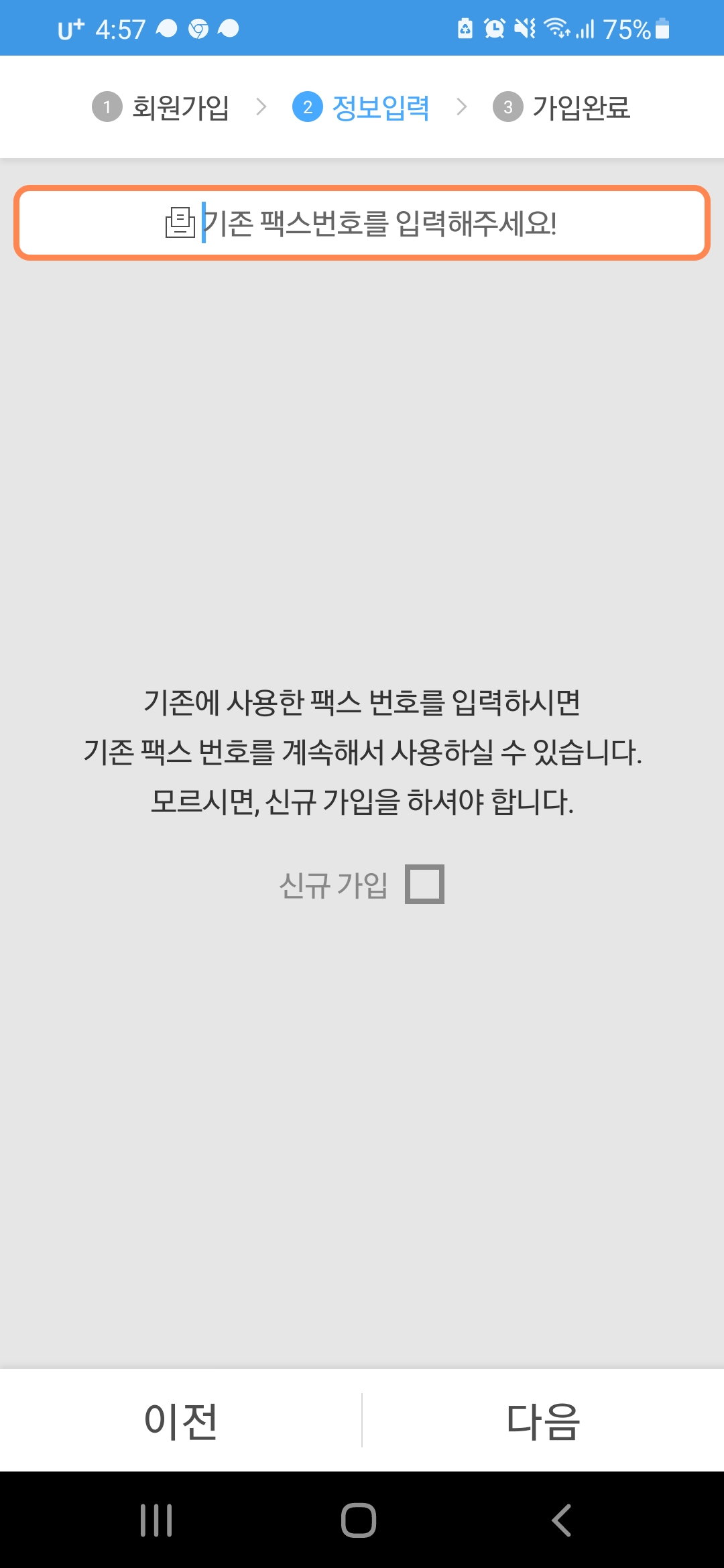 전에 이 앱을 쓰다가 새 전화기로 바꾸고 앱을 깔지 않았는데, 안 쓰는 사이에 번호를 회수한 모양이더군요. 옛 수신팩스번호로 가입된 정보가 없다고 해서 새로 가입하며 팩스수신번호를 만들었습니다.