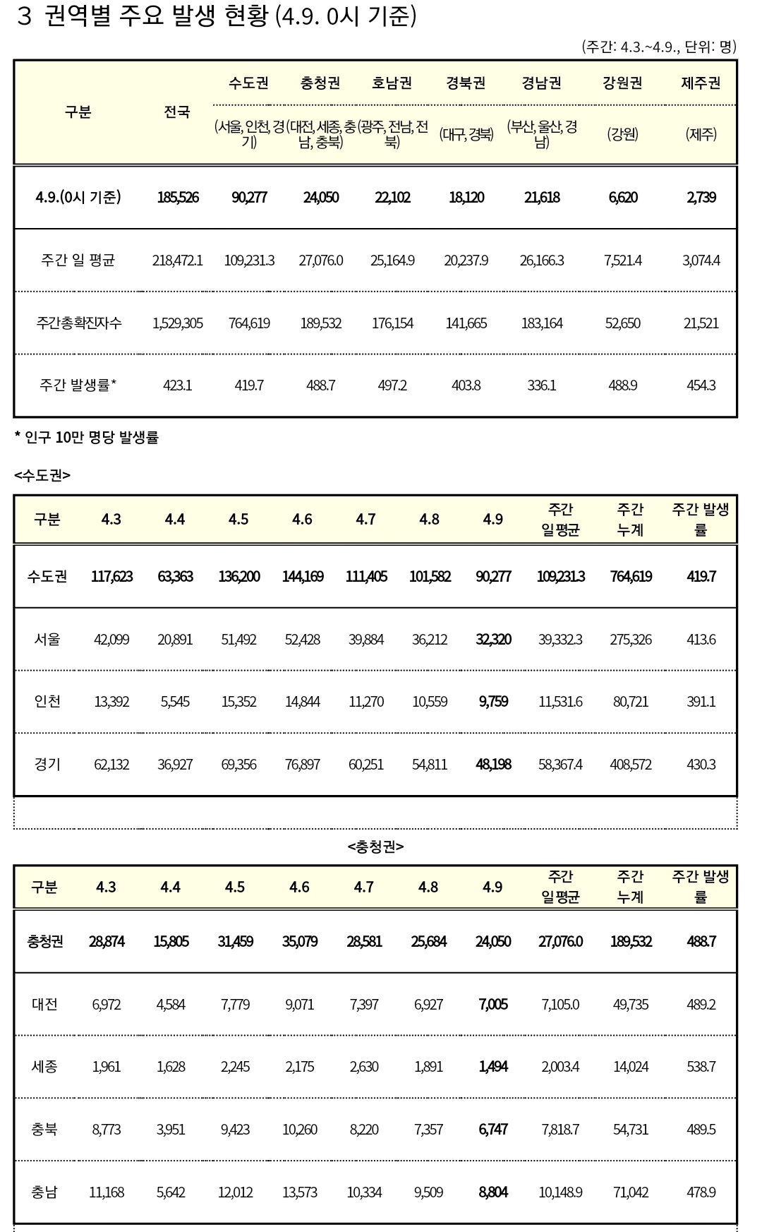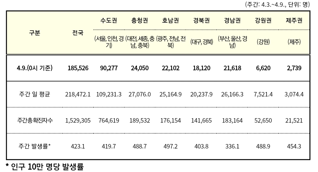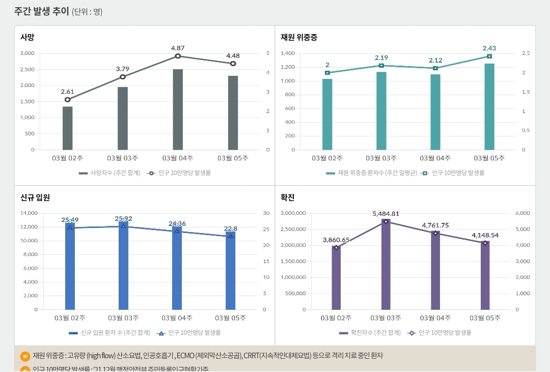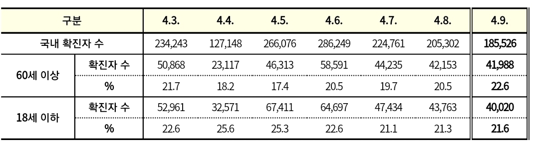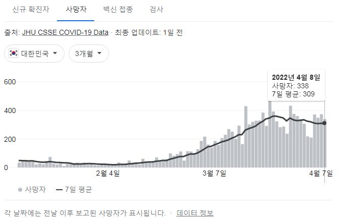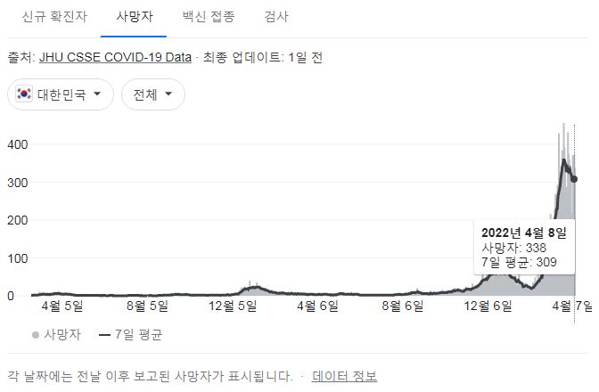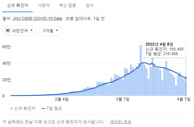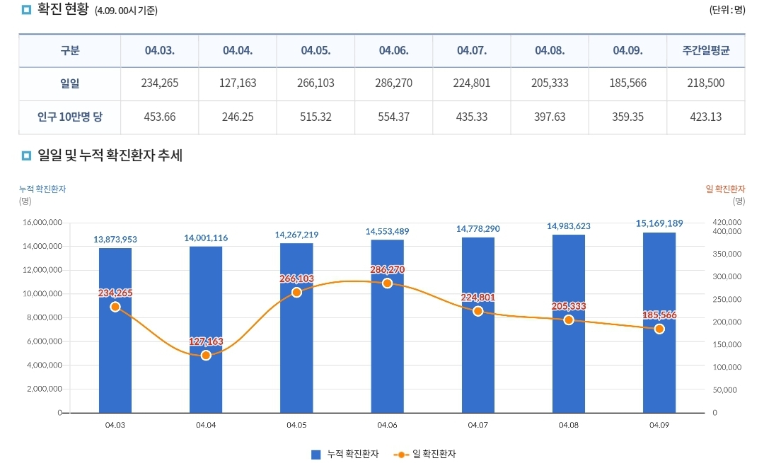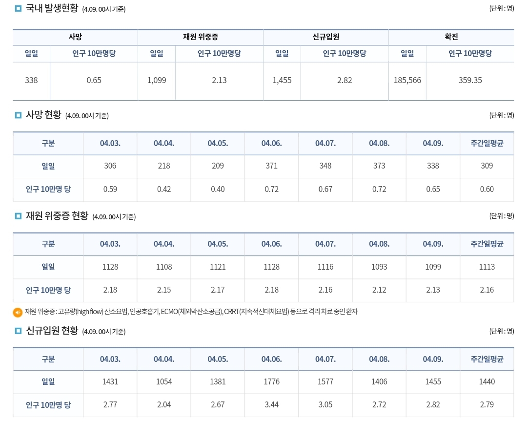 코로나19집계(2022.4.9. 0시기준): 확진 +18.6만, 사망 +338명, 재택치료 124만(집중관리 11.5만)/:/ 몇 가지 그래프 본문