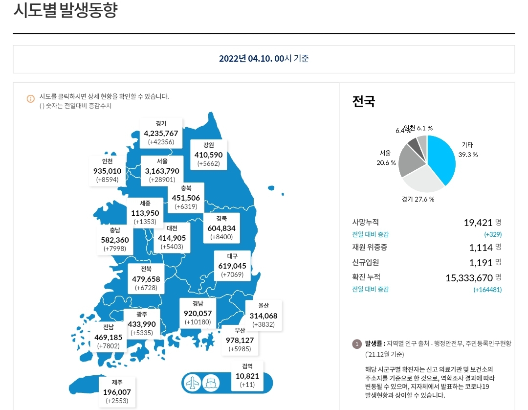 | 코로나19집계(2022.4.10. 0시기준): 확진 +16.4만, 사망 +329명, 중환자실 가동률 58%, 재택치료 ?만(집중관리 ?만) (0) | 2022.04.10 |