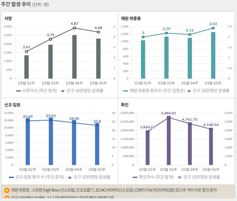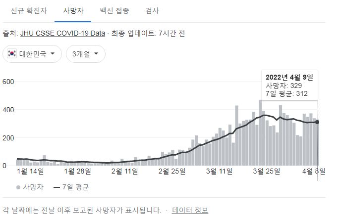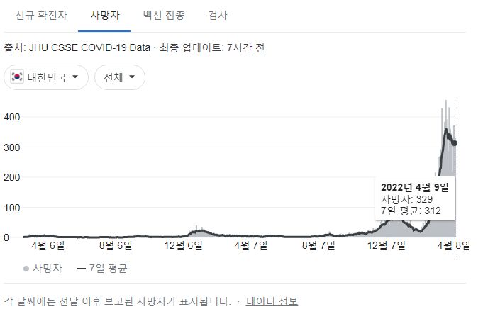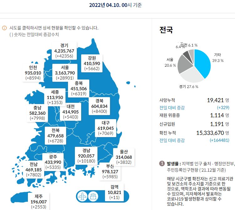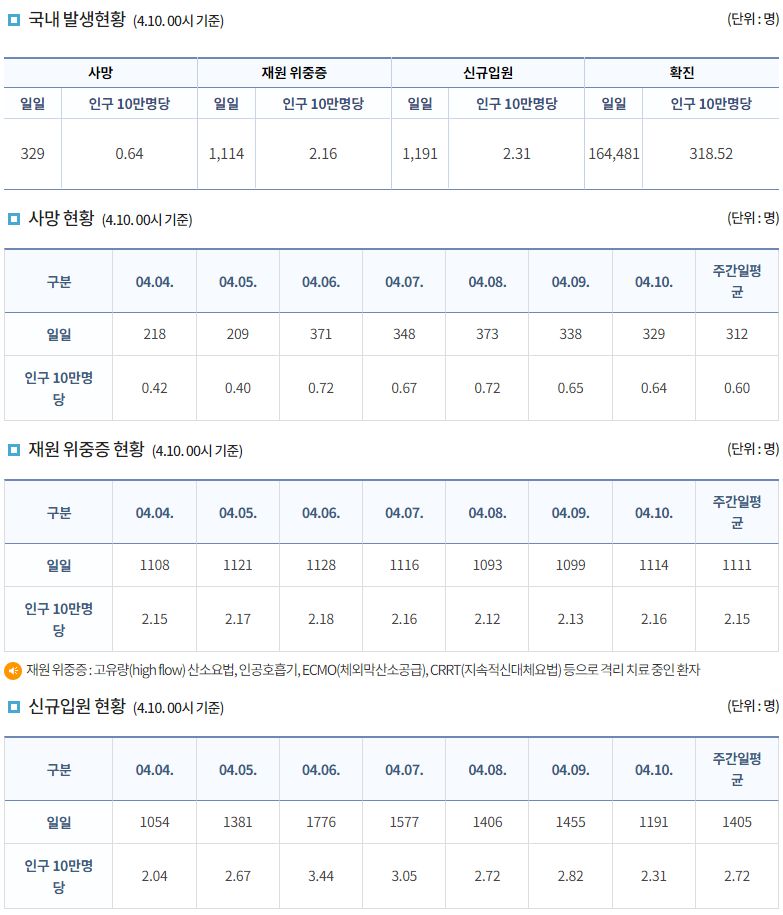 코로나19집계(2022.4.10. 0시기준): 확진 +16.4만, 사망 +329명, 중환자실 가동률 58%, 재택치료 ?만(집중관리 ?만) 본문