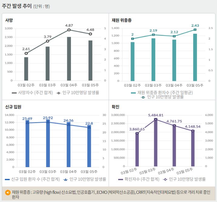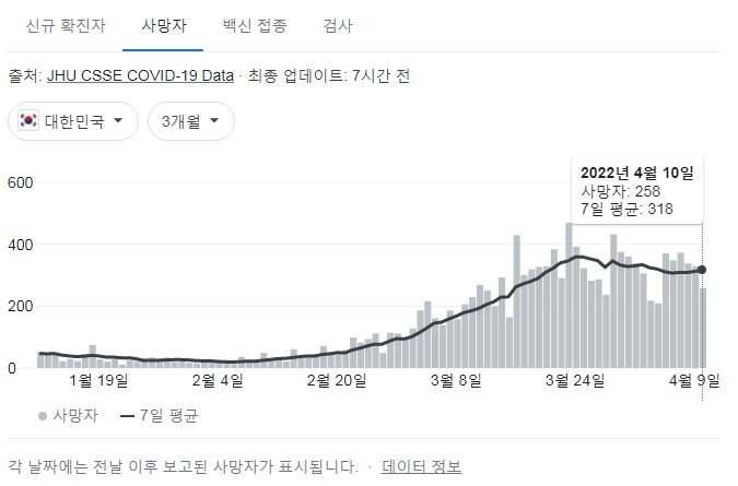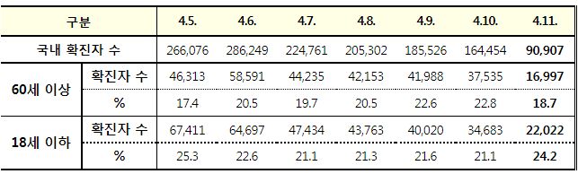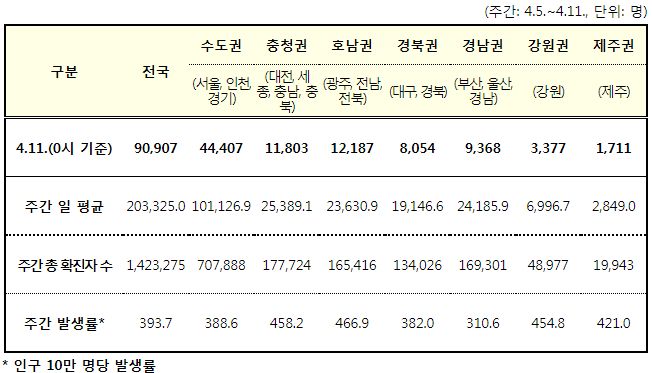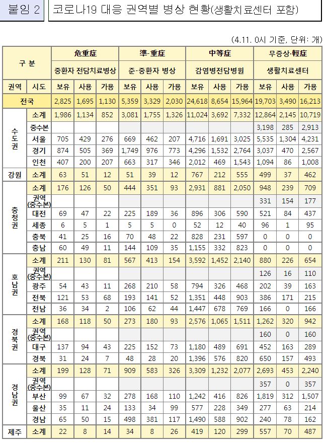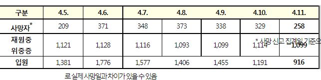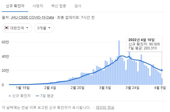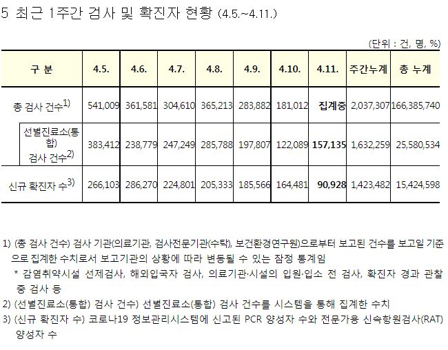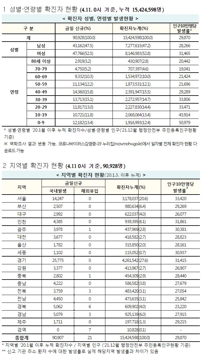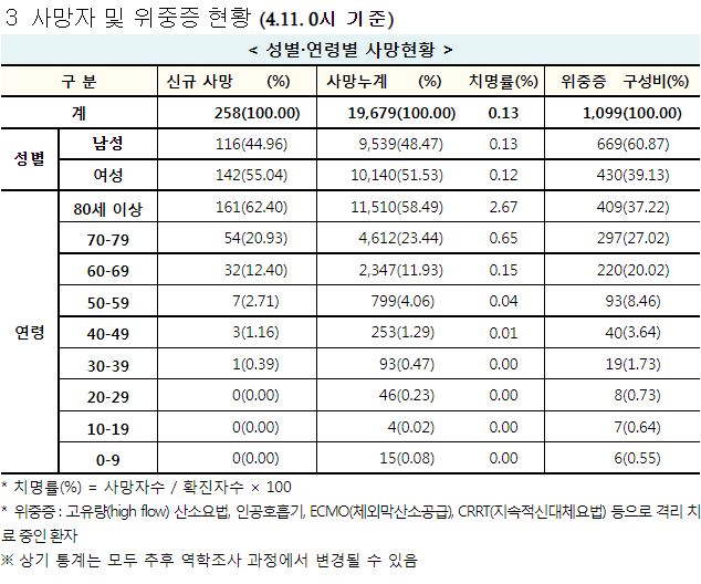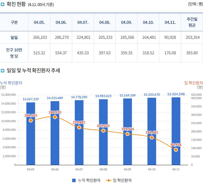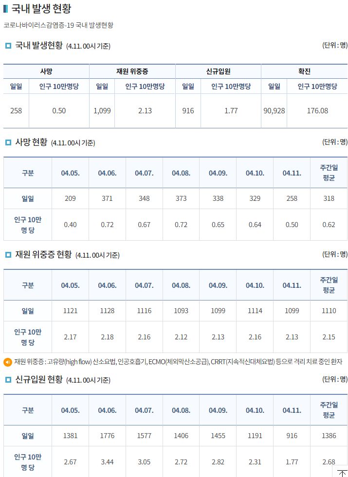 코로나19집계(2022.4.11. 0시기준): 확진 +9.1만, 사망 +258명, 중환자실 가동률 60%, 재택치료 121만(집중관리 10만) 본문