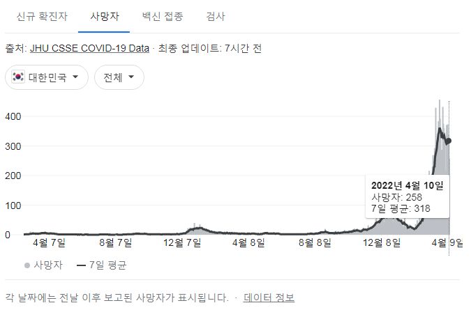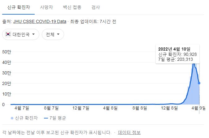 | 코로나19집계(2022.4.10. 0시기준): 확진 +16.4만, 사망 +329명, 중환자실 가동률 58%, 재택치료 ?만(집중관리 ?만) (0) | 2022.04.10 |