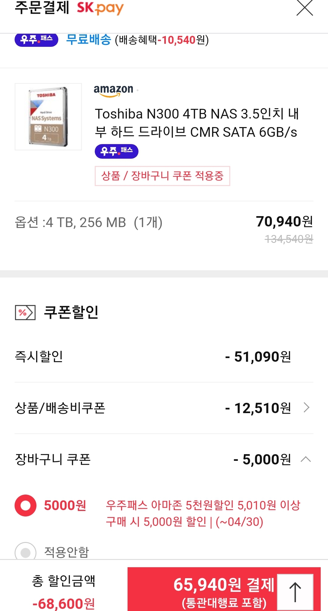 (11번가-아마존) 도시바 N300 4TB 7200rpm CMR HDD (~6.6만원/우주패스) 본문