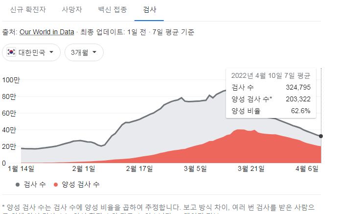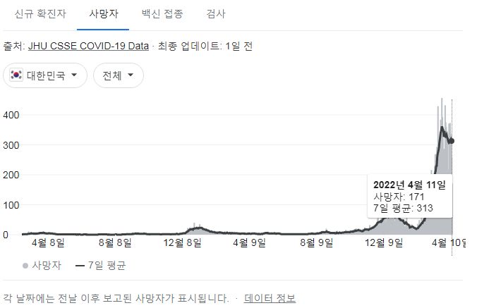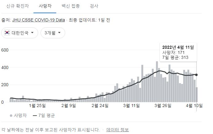 | 코로나19집계(2022.4.14. 0시기준): 확진 +15만, 사망 +318명, 중환자실가동률 51%, 재택치료 95만(집중관리 8.5만)/:/ 백신도입계약물량 ~1.4억 회분/:/ 구글그래프 4.13, 4.14 (0) | 2022.04.14 |