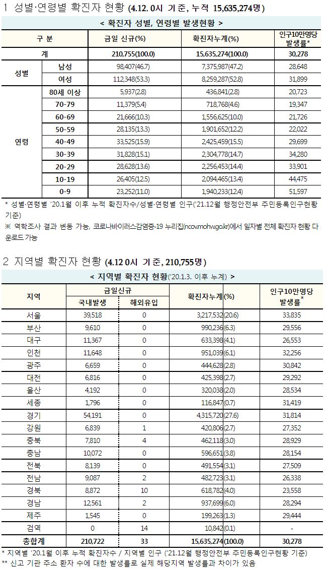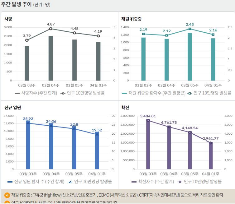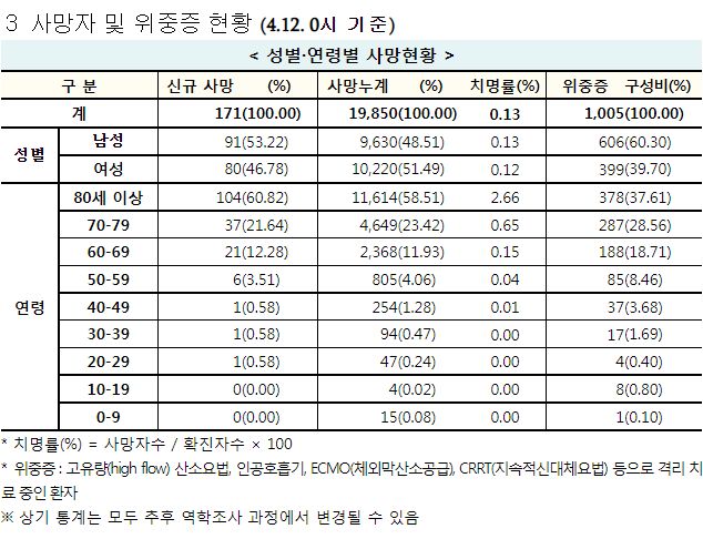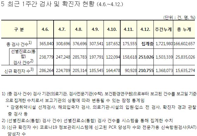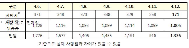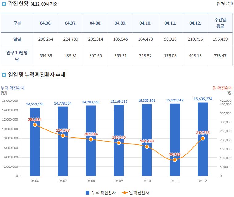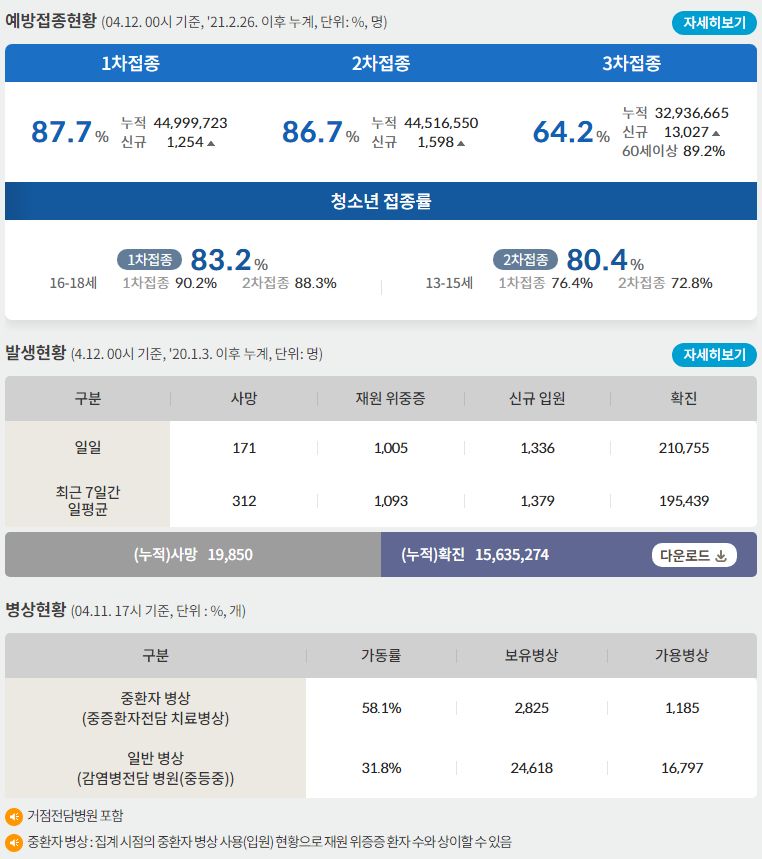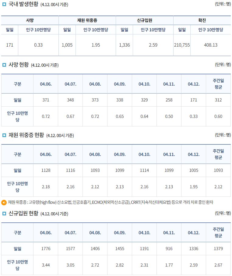 코로나19집계(2022.4.12. 0시기준): 확진 +21만, 사망 +171명, 중환자실가동률 58%, 재택치료 103만(집중관리 9.3만) 본문