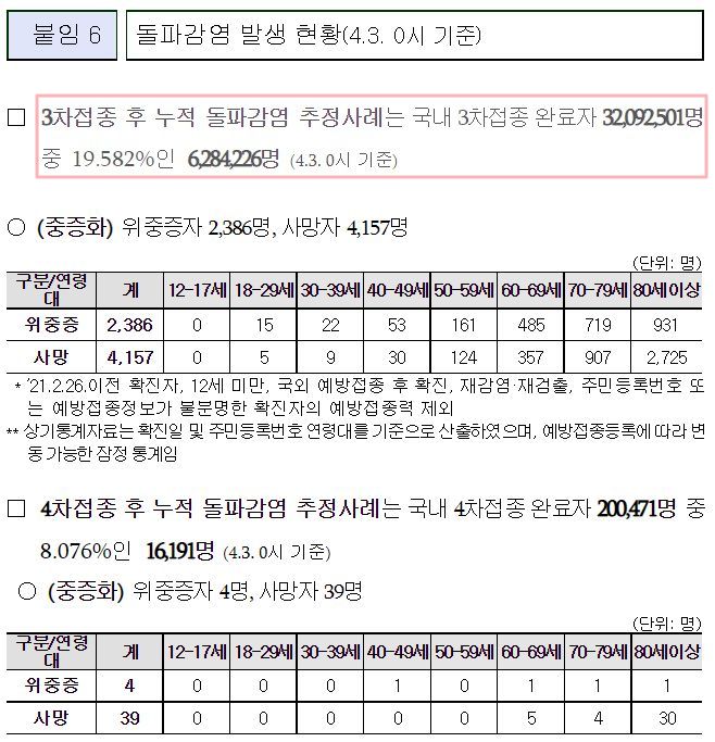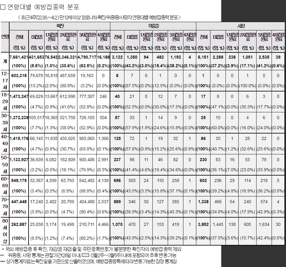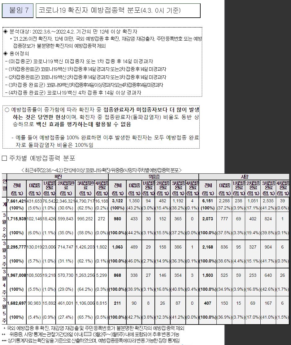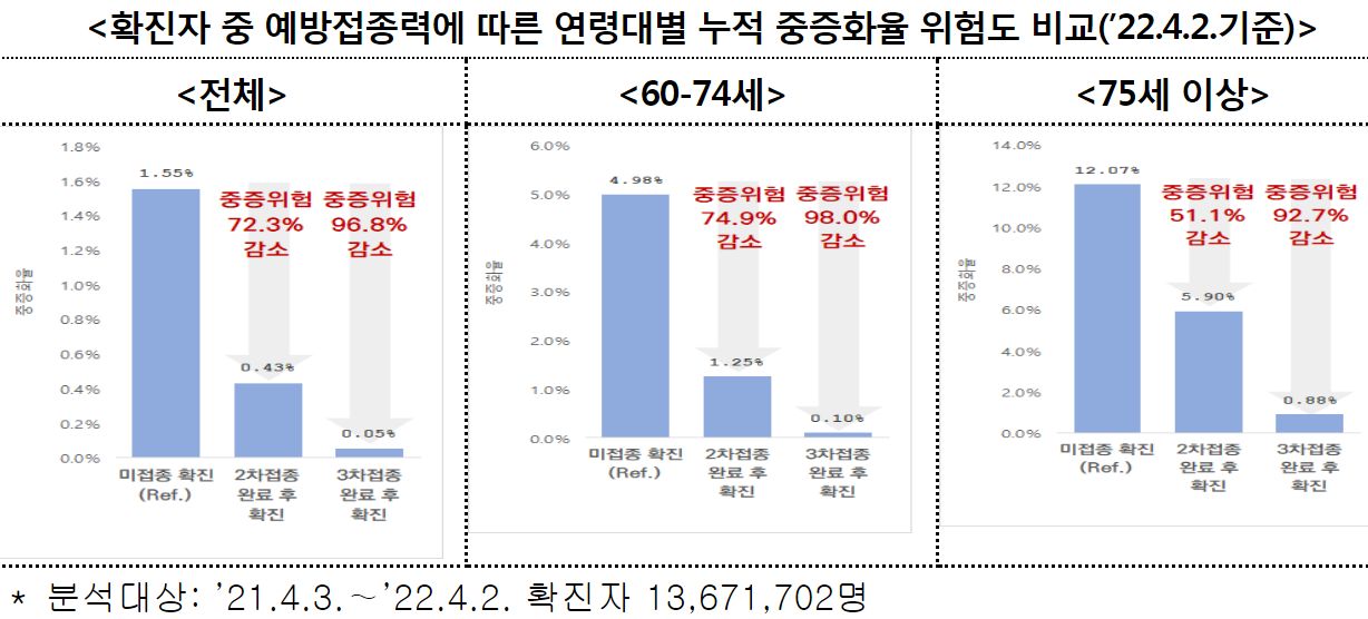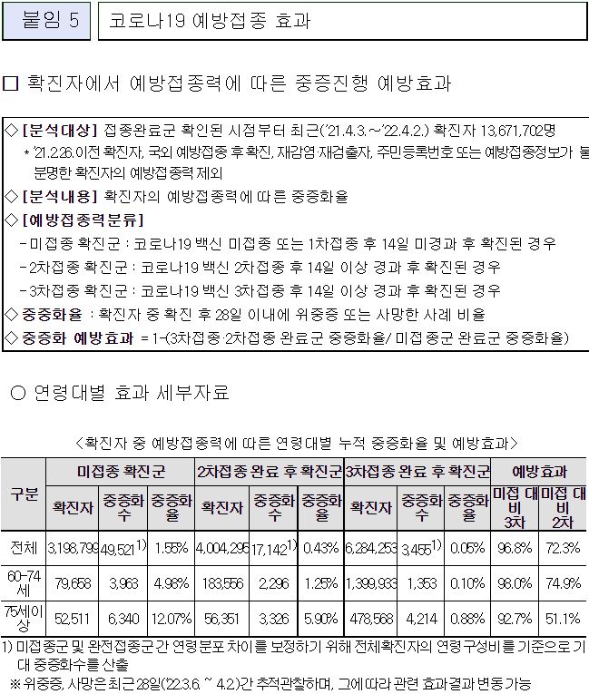 "예방접종 효과분석 결과, 3차 접종을 완료하면 접종 후 확진되더라도 미접종자에 비해 중증진행 위험이 96.8% 감소되므로, 예방접종은 여전히 유효한 방역수단이고 고령층·기저질환자에게 3차접종 완료는 특히 중요하다. ‘미접종자 확진군’의 중증화율은 ‘3차접종 완료 후 확진군’에 비해 31.0배, ‘2차접종 완료 후 확진군’에 비해 3.6배가 높았다."