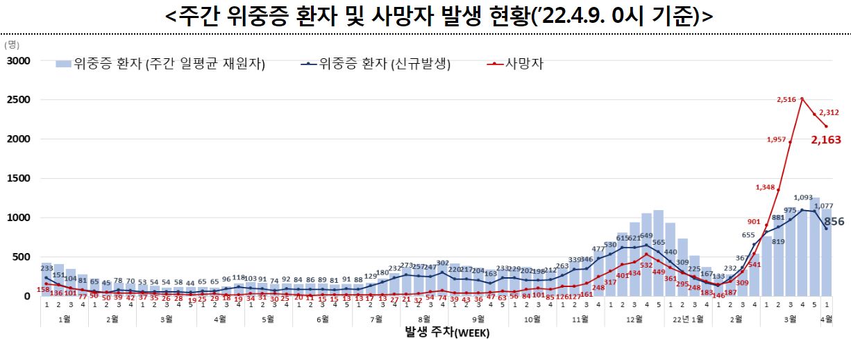 주간 신규 위중증 환자 수는 감소. 사망자도 감소.
