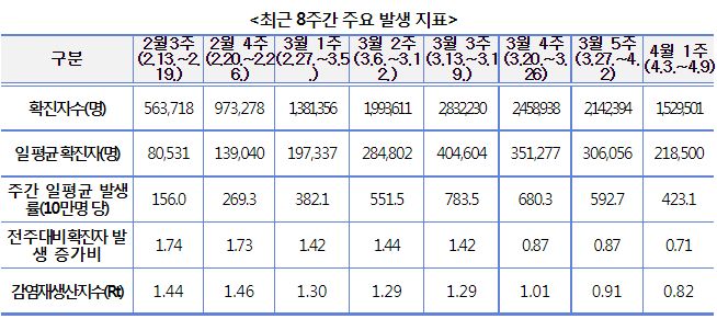 감염재생산지수(Rt) 0.82 로, 일일확진자집계는 앞으로 계속 감소할 것으로 예상.