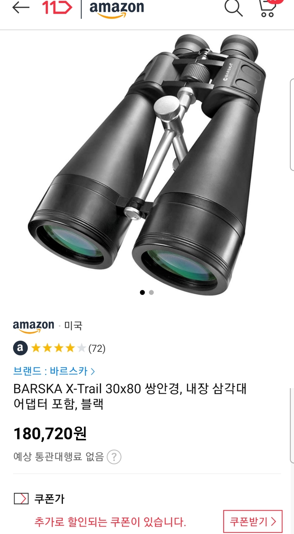 (11번가-아마존) BARSKA X-Trail 30x80 쌍안경(30배율, 80mm렌즈) (~15.6만/우주패스, ~16.1만/일반) 본문