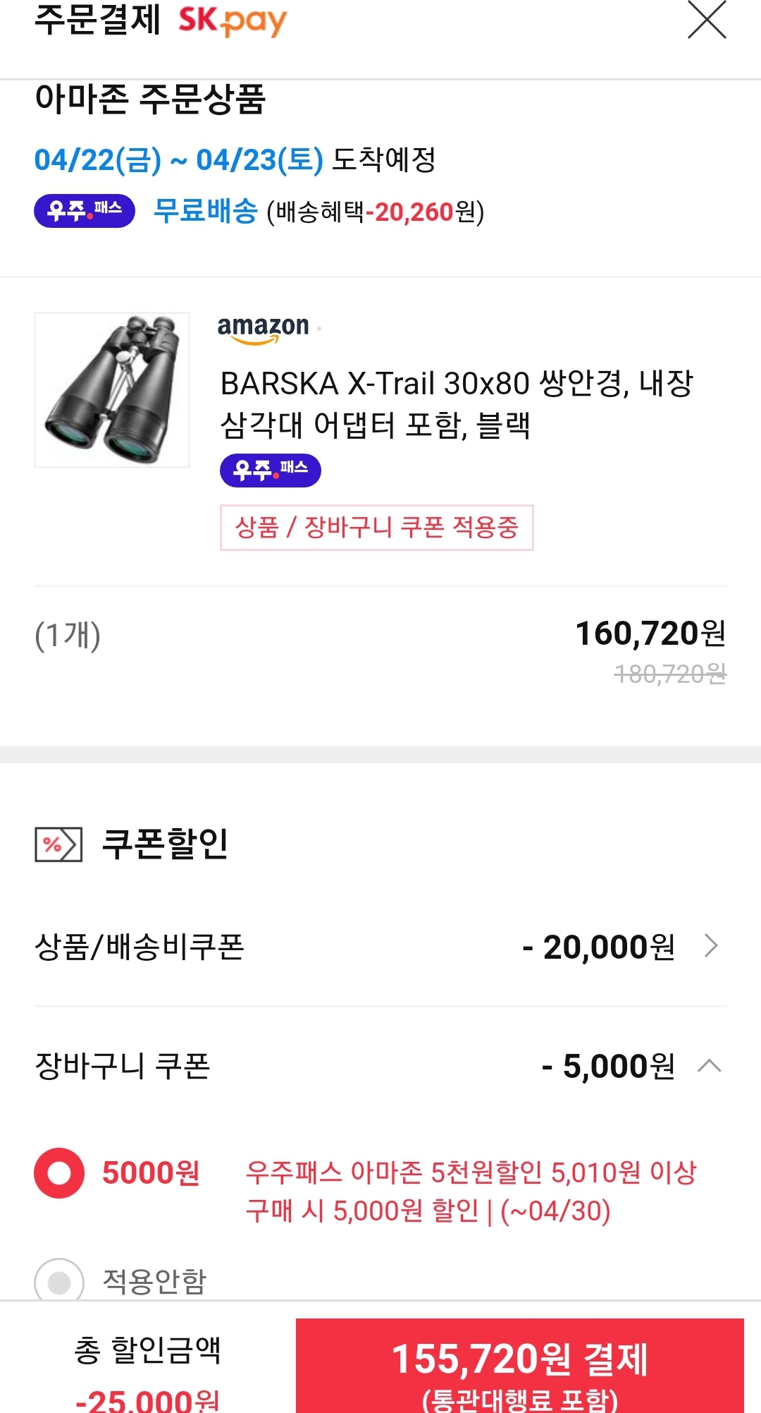 할인은 상픔페이지에서 아마존위크할인 2만원짜리 5대카드용을 받고, 결제페이지에서 우주패스장바구니 5천원 적용.