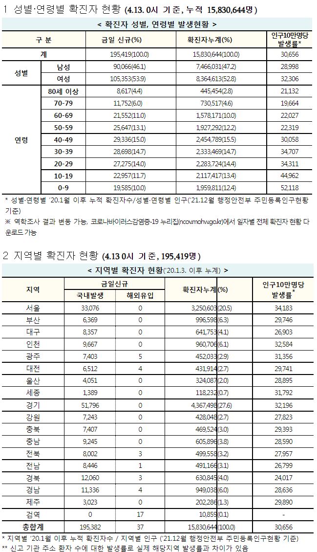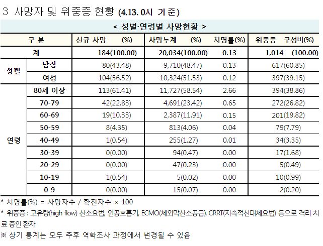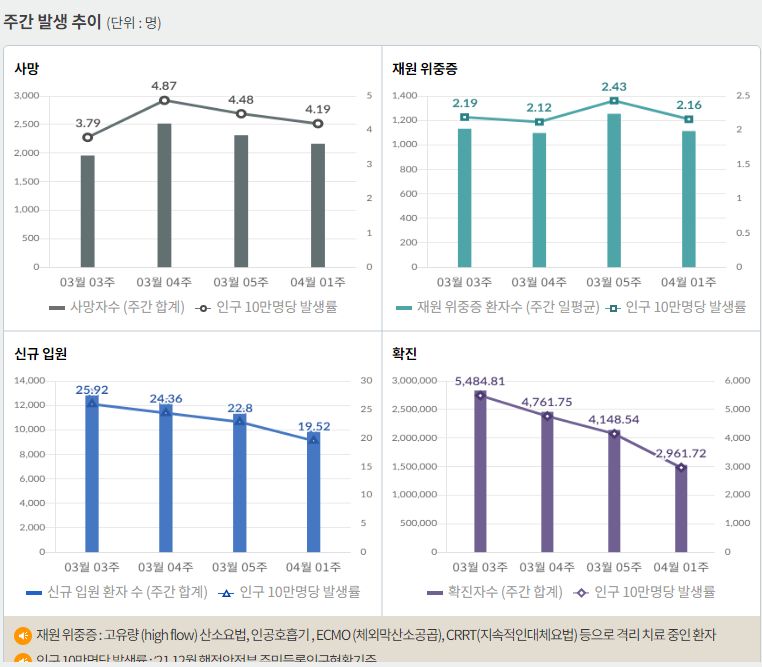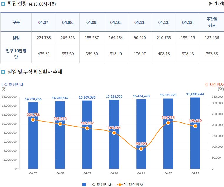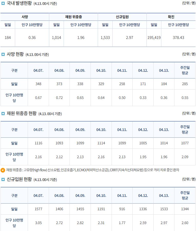코로나19집계(2022.4.13. 0시기준): 확진 +18만, 사망 +184명, 중환자실가동률 55%, 재택치료 99만(집중관리 8.9만)/:/ 누적사망자 2만 명+ ★ 본문