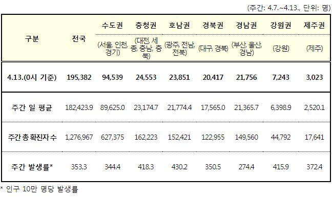 그런데 이렇게 한 번으로 줄인 브리핑에서, 바로 위 표의 권역별 차트(예를 들어 서울의 최근 1주일 추이)가 들어가기도 하고 안 들어가기도 하는 것 같습니다. 넣어주면 좋겠는데.. 자기 지역 추이를 보려는 사람들은 불편하겠네요.