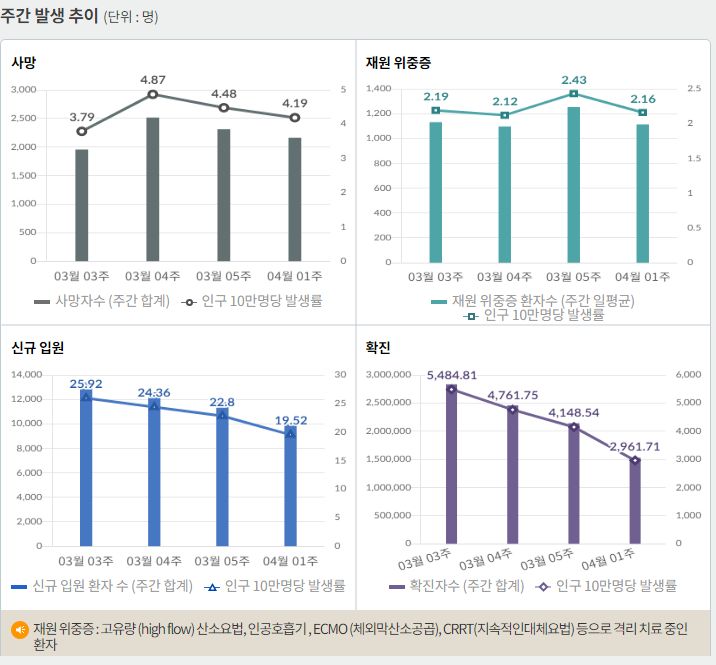 확진자, 중환자수는 줄고 있지만 사망자수는 줄지 않고 있습니다.
