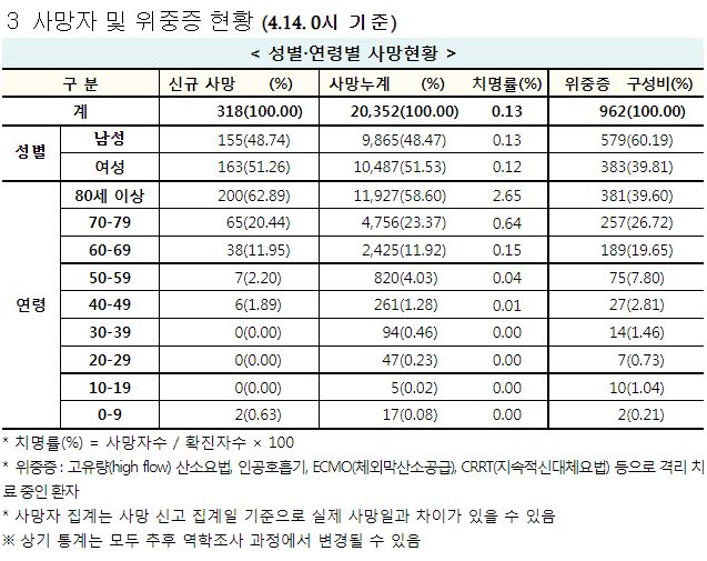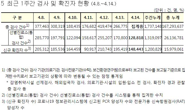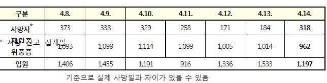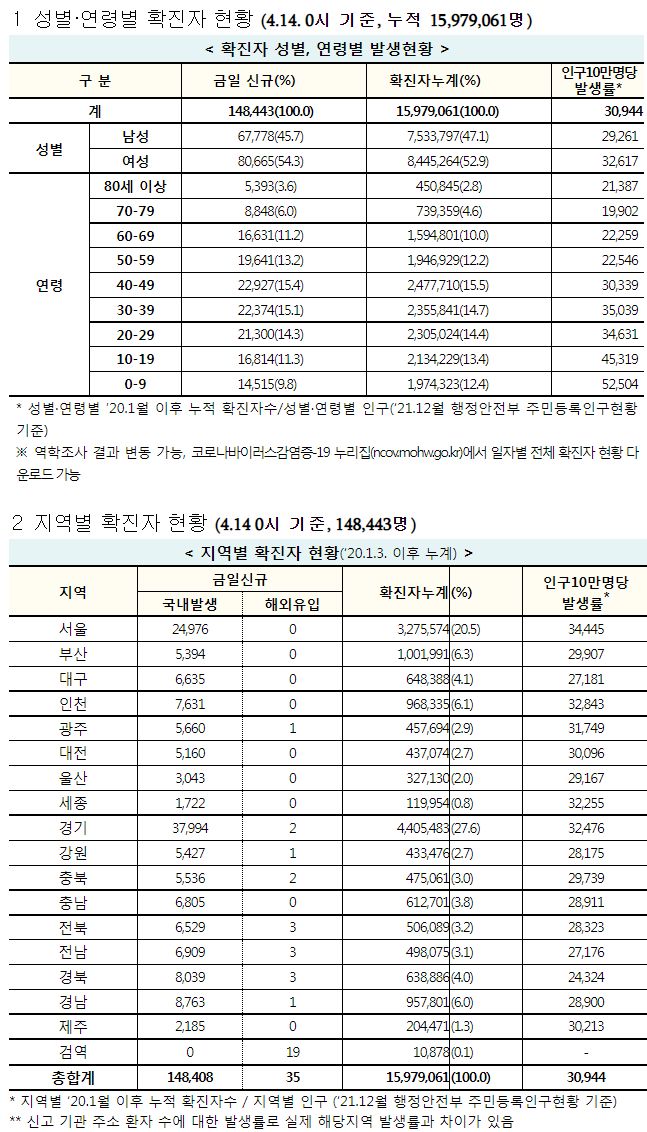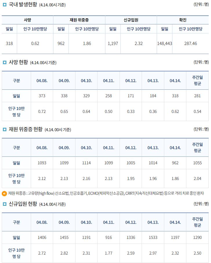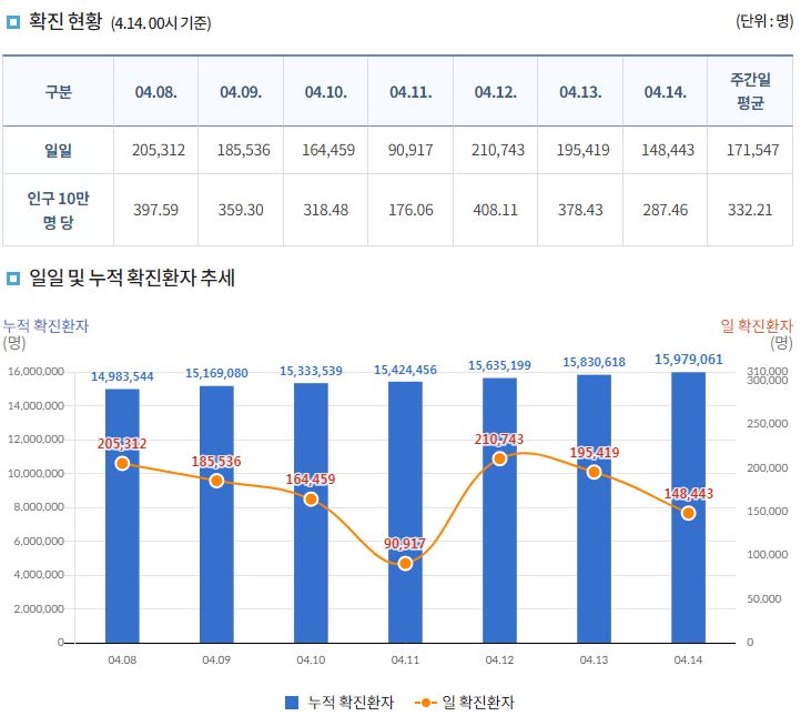 코로나19집계(2022.4.14. 0시기준): 확진 +15만, 사망 +318명, 중환자실가동률 51%, 재택치료 95만(집중관리 8.5만)/:/ 백신도입계약물량 ~1.4억 회분/:/ 구글그래프 4.13, 4.14 본문