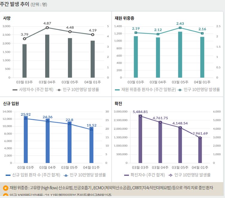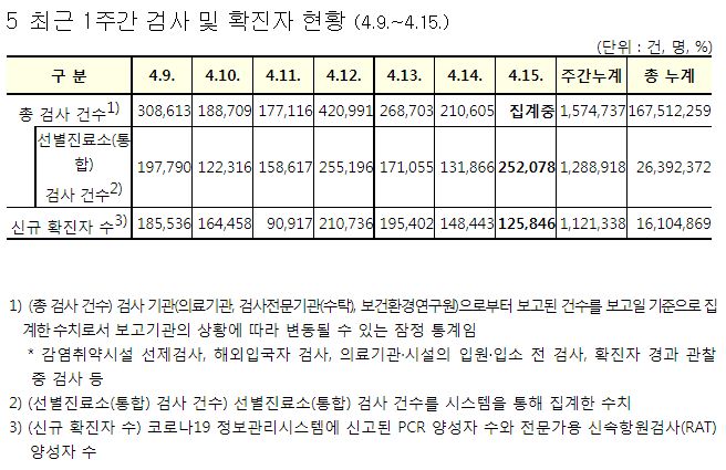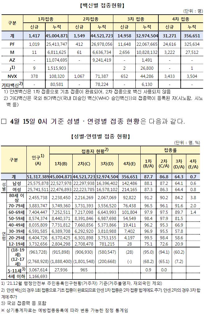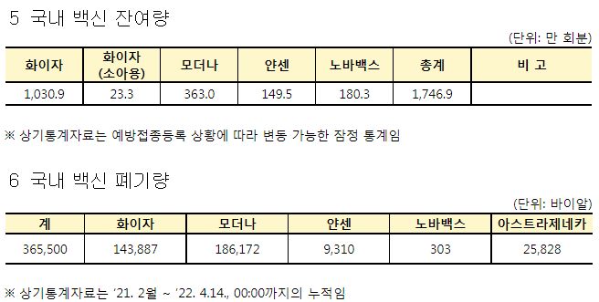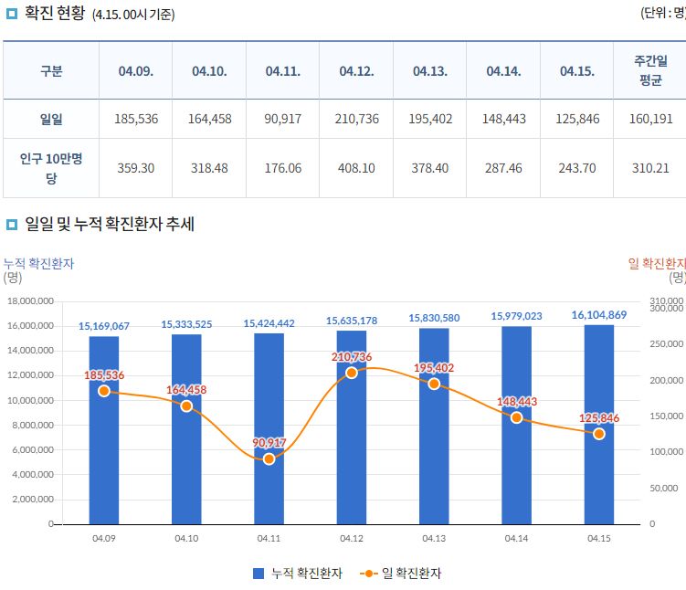 코로나19집계(2022.4.15. 0시기준): 확진 +12.6만, 사망 +264명, 중환자실 가동률 50%, 재택치료 91만(집중관리 7.9만), 최근2달반 백신폐기량 36.6만/잔여계약량 1.4억 본문