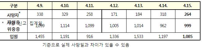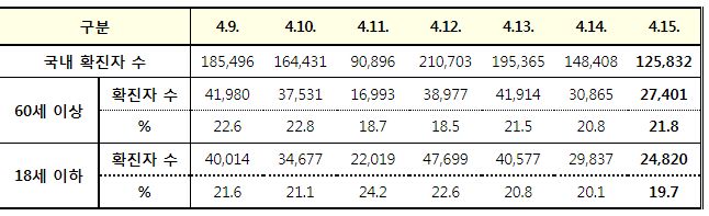 | 코로나19(2022.4.15) "사회적 거리두기 조치 약 2년 1개월만에 해제"보도자료/:/ 실내외 마스크착용은 계속 (0) | 2022.04.15 |