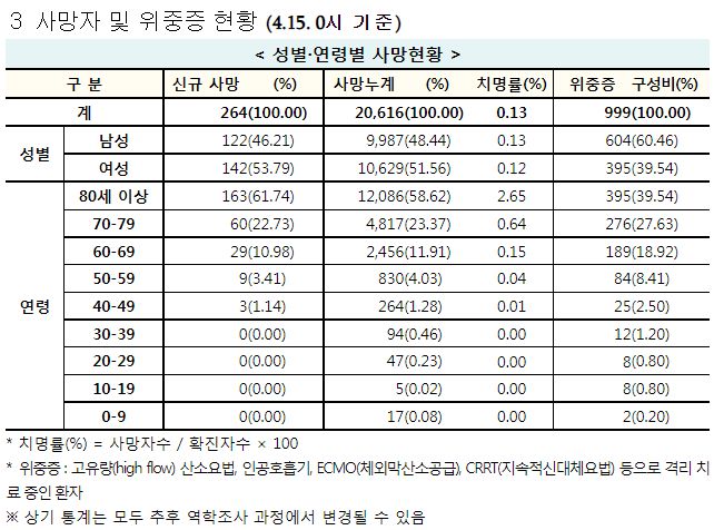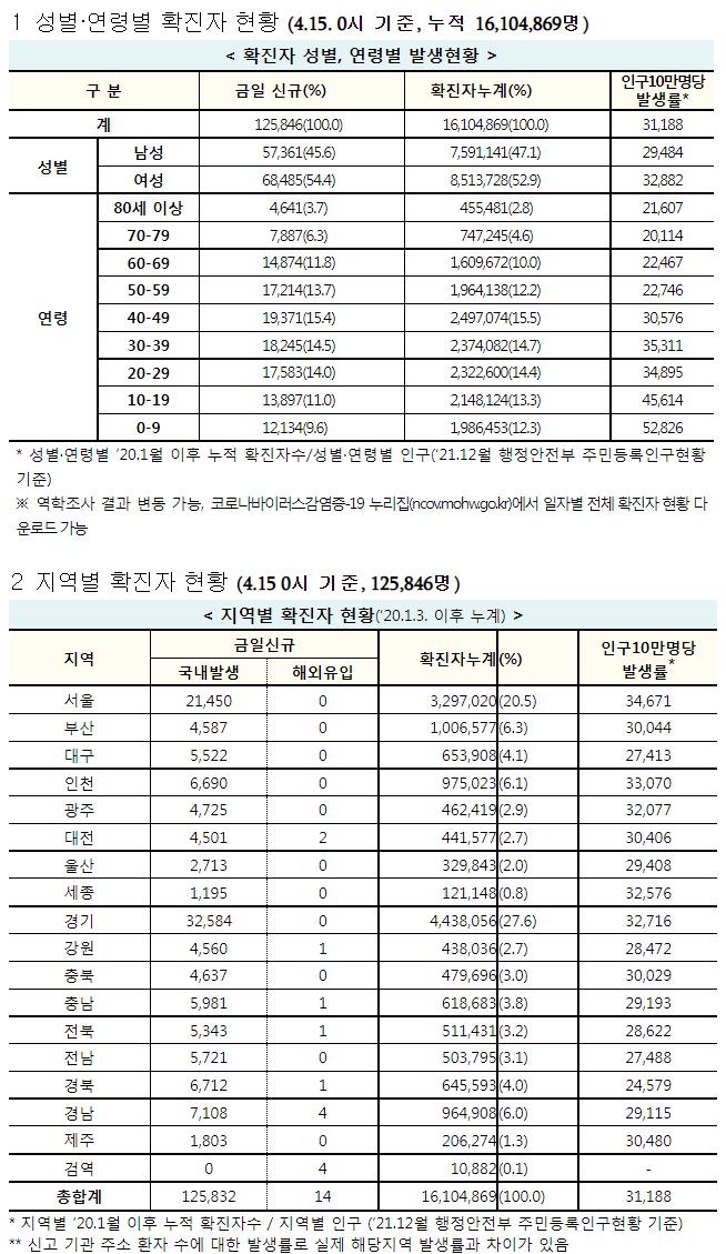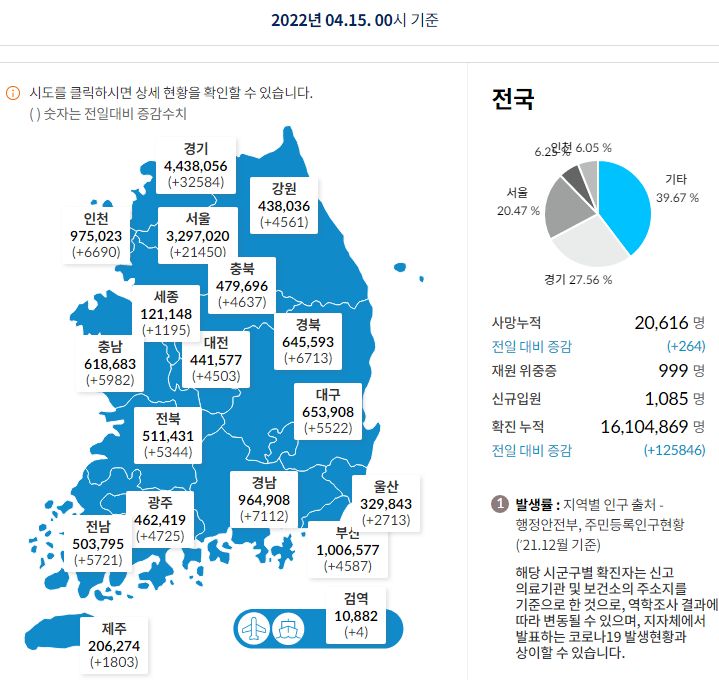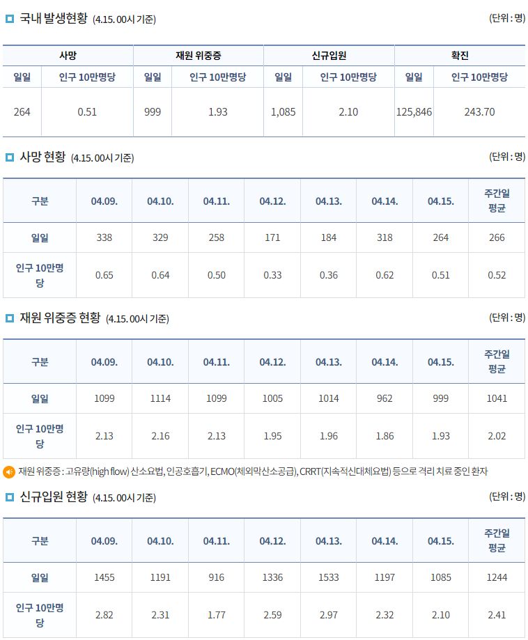 코로나19집계(2022.4.15. 0시기준): 확진 +12.6만, 사망 +264명, 중환자실 가동률 50%, 재택치료 91만(집중관리 7.9만), 최근2달반 백신폐기량 36.6만/잔여계약량 1.4억