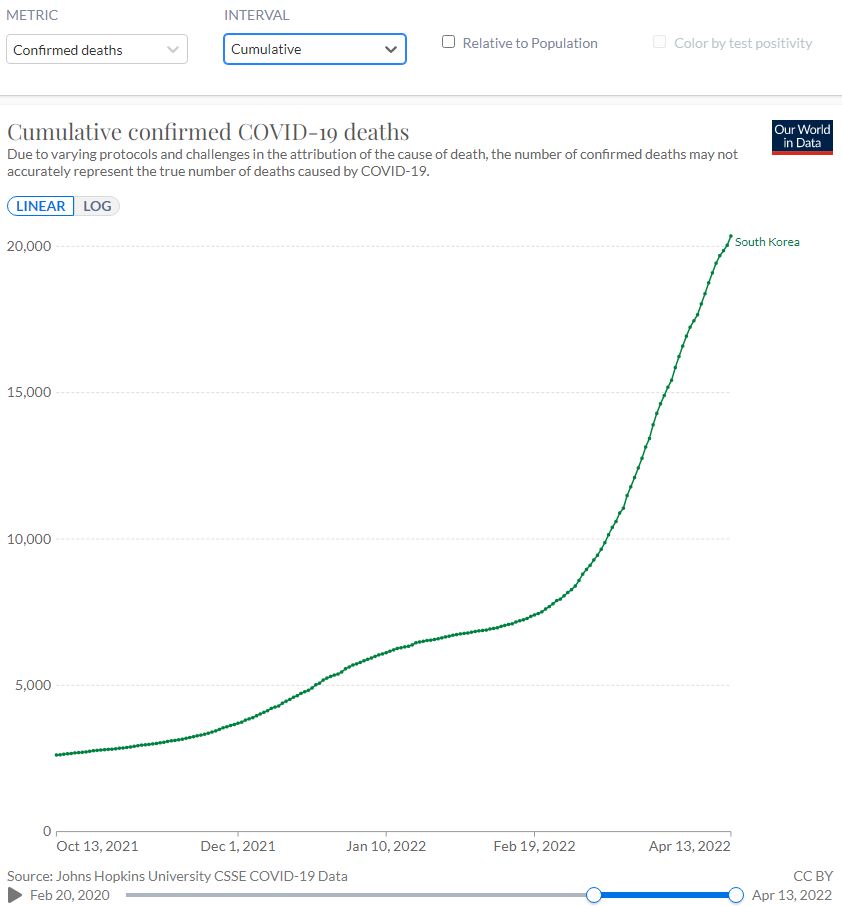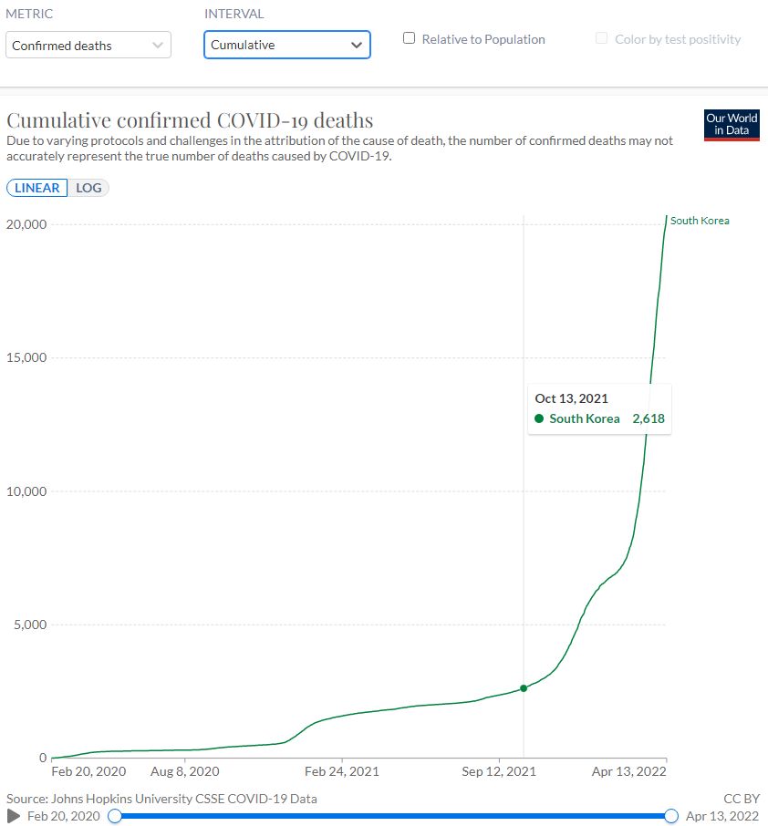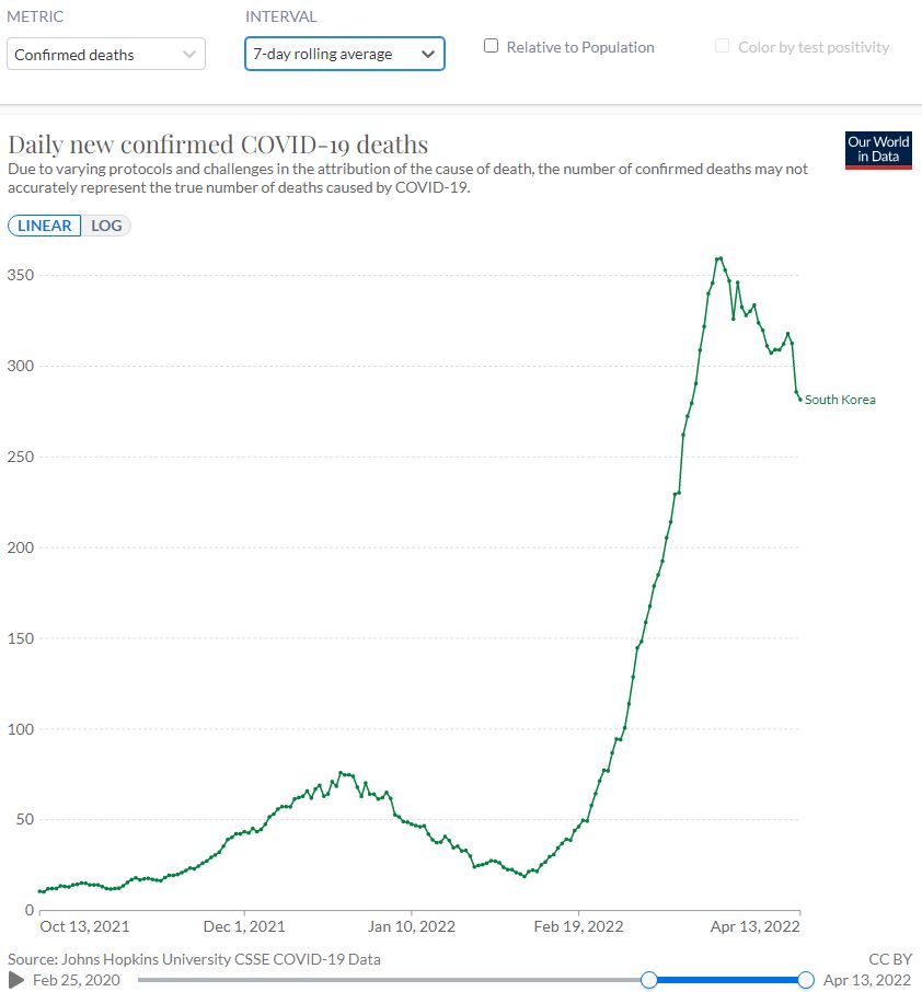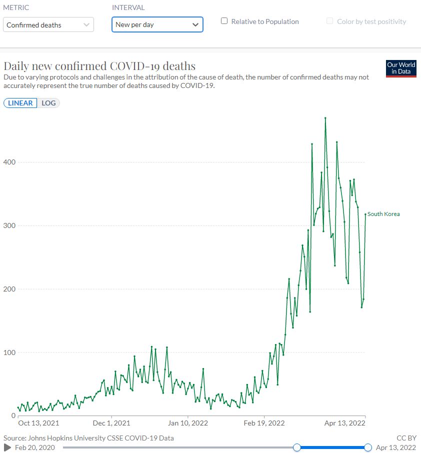 위 오늘자 보도자료에서는 "사망자수가 완만히 감소하고 있는 상황"이라고 자화자찬했지만, 아직 무척 많이 죽고 있습니다. 코로나19 팬데믹이 시작된 이래 매일매일 가장 많이 죽어나가고 있는 게 현재입니다.