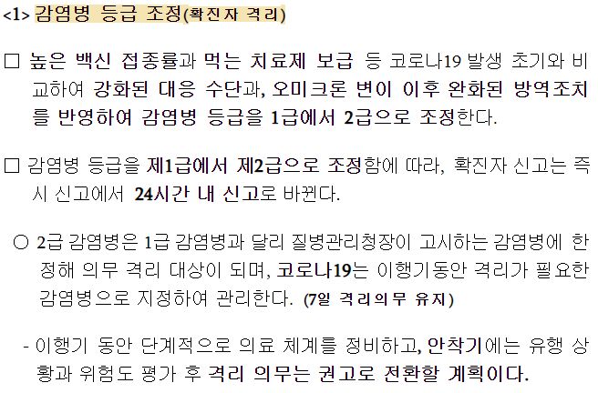 ㅡ 확진자 7일 자가격리의무는 유지.. 나중에 권고1로 바꾸겠지만 지금은 의무 그대로.