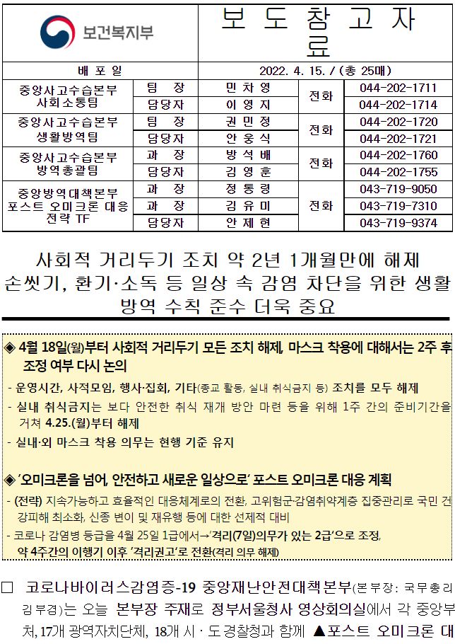 코로나19(2022.4.15) "사회적 거리두기 조치 약 2년 1개월만에 해제"보도자료/:/ 실내외 마스크착용은 계속 본문