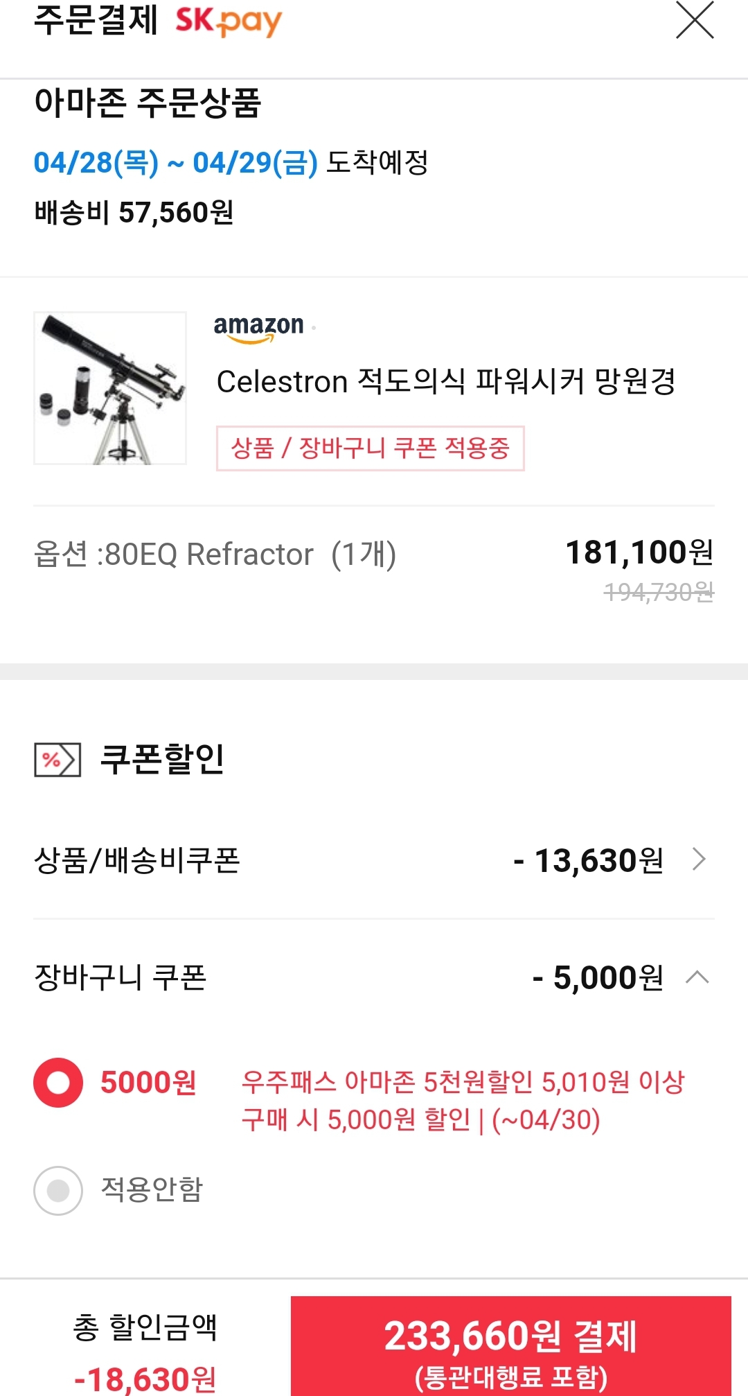 할인은 상품페이지에서 받을 수 있는 쿠폰과 아마존장바구니쿠폰.
