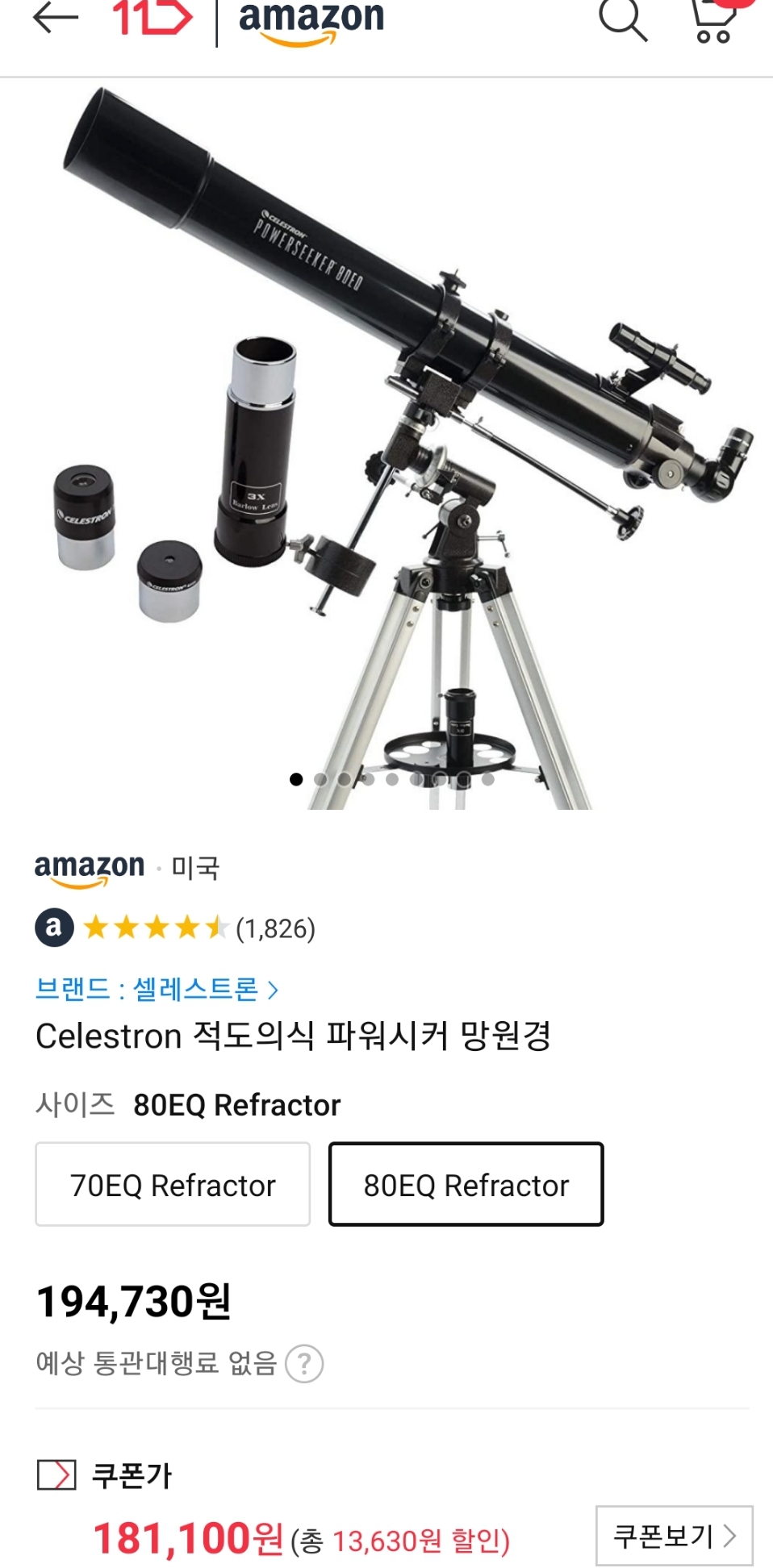 (11번가-아마존) 셀레스트론 파워시커 80EQ 80mm 적도의식 굴절 천체망원경 (~23.4만원/우주패스) 본문