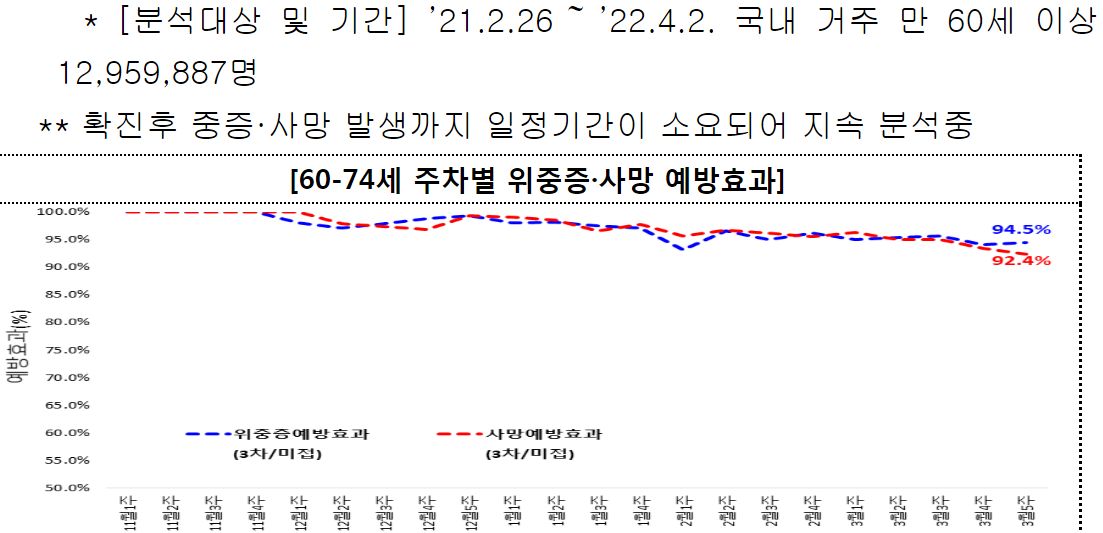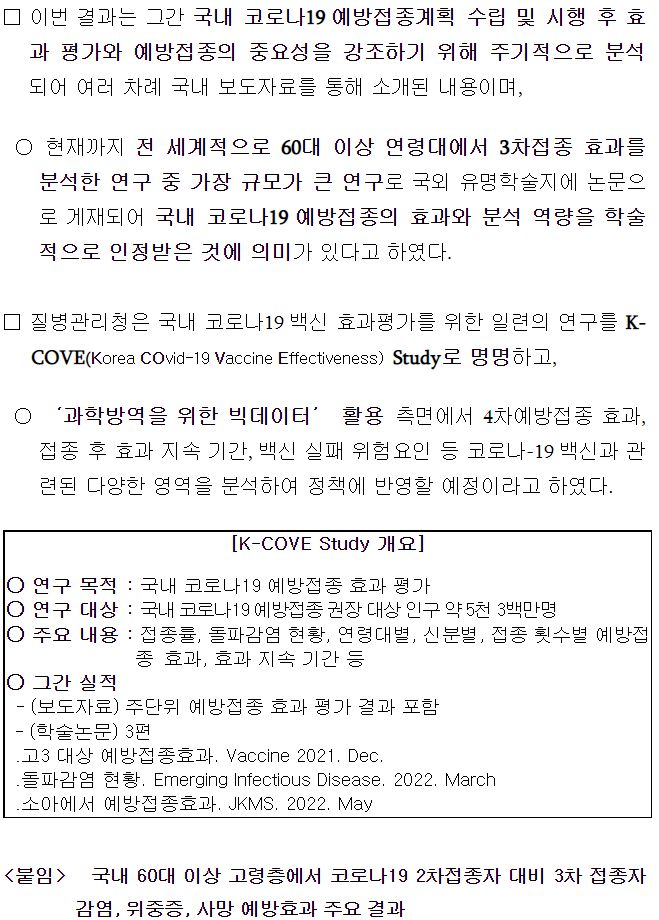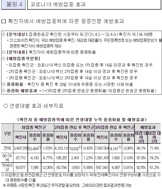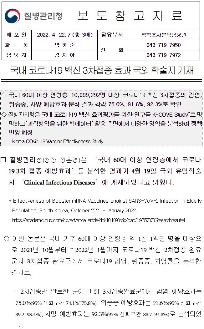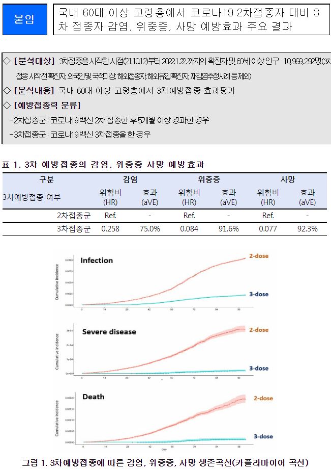 (2022. 4.22.) 국내 60대 이상 고령층에서 코로나19 2차접종자 대비 3차 접종자 감염, 위중증, 사망 예방효과 주요 결과 - 질병관리청 보도자료.