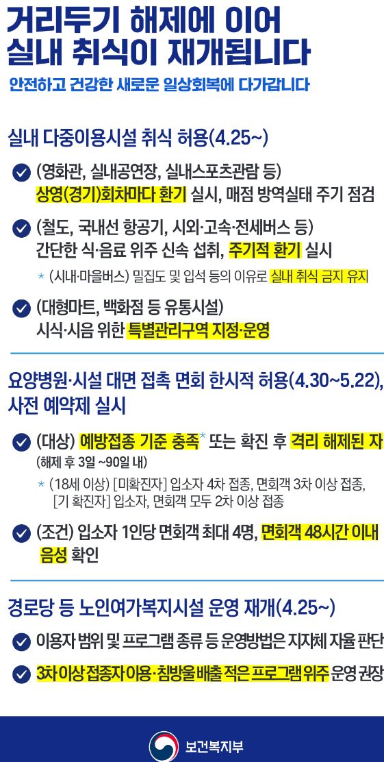 코로나19(2022.4.22) 4월 25일(월)부터 실내 다중이용시설 취식 허용,4월 30일(토)~5월 22일(일) 요양병원·시설 대면 접촉 면회 한시적 허용 본문