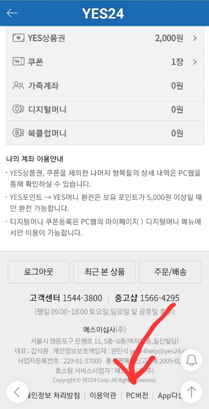 2. 더 쉬운 방법으로, yes24 앱 하단에서 "PC버전"을 터치한다.